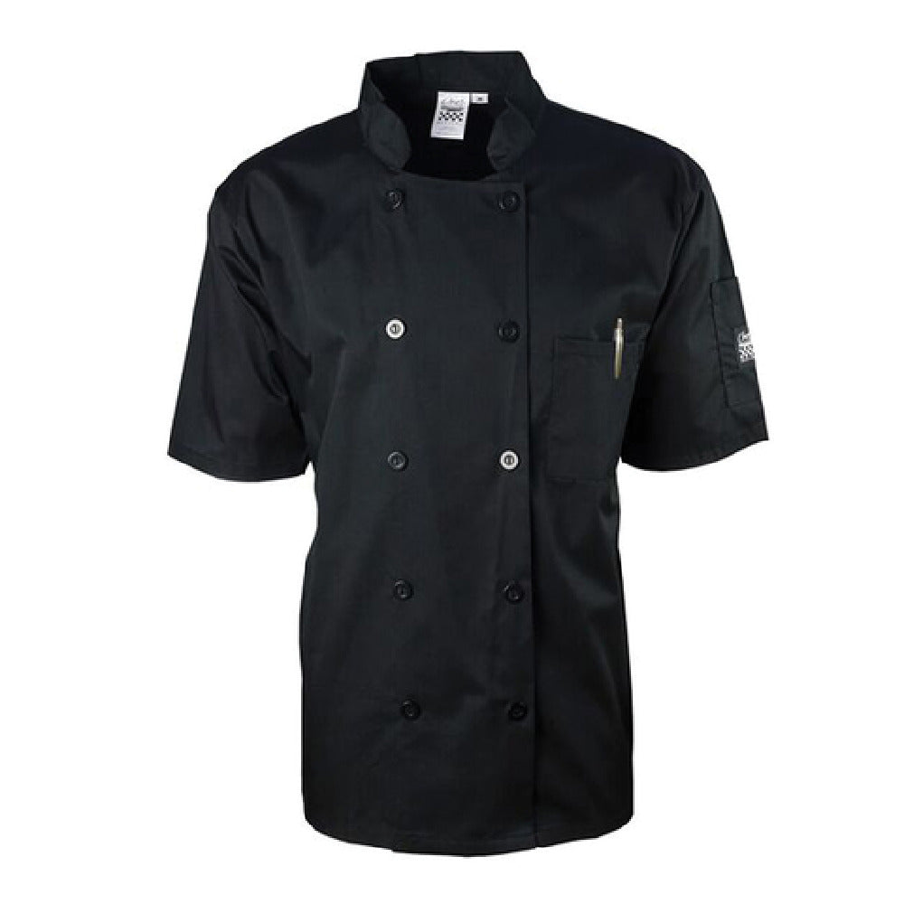 The John Ritzenthaler Company J109BK-3X Chef Revival® Basic Chef's Jacket 3X-large Universal Fit is expertly crafted for culinary professionals seeking both style and functionality. This jacket is designed with a universal fit and comes in a size 3X-large, making it an excellent choice for chefs who prioritize comfort without compromising on a professional appearance. Its double-breasted design features 10 clear pearl buttons, enhancing the traditional look that is a staple in the culinary industry. Constructed from a poly/cotton blend, this jacket offers a balance of durability and breathability, essential for demanding kitchen environments. The garment is completed with a traditional collar and short sleeves, providing a classic and comfortable fit. Practicality is further emphasized by the inclusion of a front chest pocket and a pen/thermometer pocket, offering convenience for chefs who need quick access to tools and essentials. Available in a sleek black color, the jacket seamlessly integrates into various kitchen settings, from bustling restaurants to educational culinary institutions. The John Ritzenthaler Company J109BK-3X Chef Revival® Basic Chef's Jacket is packed as one each, ensuring chefs receive a product ready for immediate use in professional culinary environments.