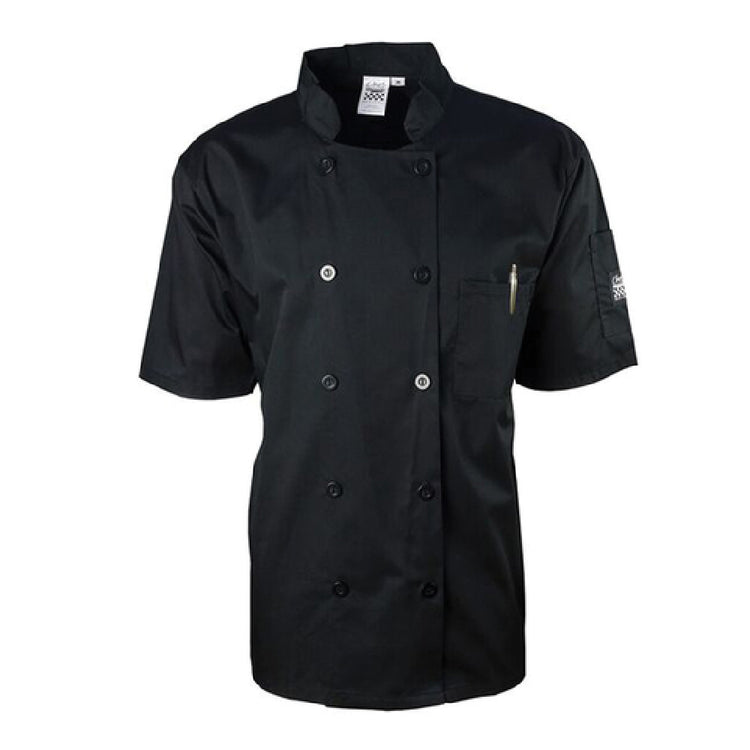 The John Ritzenthaler Company J109BK-XL Chef Revival® Basic Chef's Jacket X-large Universal Fit is a must-have for culinary professionals seeking a blend of functionality and style. This jacket, known for its universal fit, is double-breasted and features short sleeves, making it suitable for various kitchen environments. It measures an X-large size and is crafted from a durable poly/cotton blend, ensuring comfort and longevity. The jacket includes a traditional collar and is adorned with 10 clear pearl buttons, adding a touch of elegance to its practical design. For convenience, it is equipped with a front chest pocket and a pen/thermometer pocket, meeting the needs of chefs who require quick access to essential tools. Available in black, this Chef Revival® jacket is packed individually, allowing for easy distribution in professional settings. Ideal for chefs in restaurants, catering services, and culinary schools, its thoughtful design addresses the dynamic demands of the food service industry, providing both aesthetic appeal and practical utility.