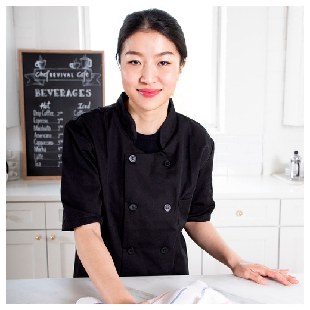 The John Ritzenthaler Company J109BK-XS Chef Revival® Basic Chef's Jacket X-small Universal Fit is a versatile garment expertly designed for culinary professionals seeking a blend of style and functionality. This jacket is double-breasted, showcasing a traditional collar, and is crafted from a durable poly/cotton blend that offers both comfort and resilience in fast-paced kitchen environments. The short sleeve design ensures ease of movement, making it ideal for chefs who require agility and comfort in their daily tasks. The jacket features a front chest pocket, complemented by an additional pen/thermometer pocket, providing convenient access to essential tools. Finished with clear pearl 10 buttons, this jacket not only emphasizes aesthetic appeal but also maintains a professional appearance. The universal fit, tailored for an X-small size, caters to a diverse range of body types, ensuring it meets the needs of chefs across different market segments within the culinary industry. Available in a sleek black color, this jacket is packed individually, aligning with hygiene and quality standards. Its thoughtful design and attention to detail make it a dependable choice for chefs seeking a reliable and professional attire solution.