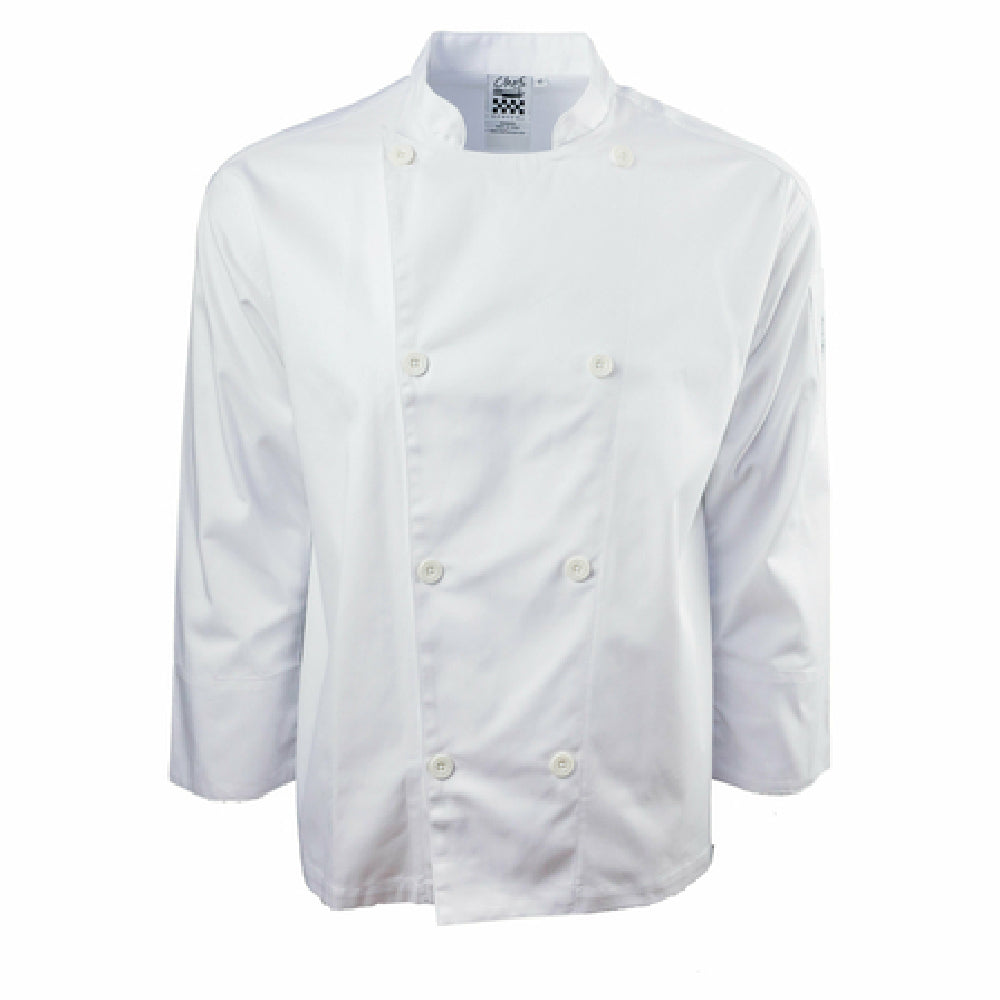 The John Ritzenthaler Company J200-M Chef RevivalĀ® Performance Series Jacket Medium Double Breasted is meticulously designed for culinary professionals seeking both style and functionality. Featuring a classic double-breasted design, this jacket is tailored with a traditional collar, adding a touch of timeless elegance to any kitchen environment. Its medium size ensures a comfortable fit, catering to a wide range of body types. The jacket is adorned with 8 chef logo buttons, which not only enhance its aesthetic appeal but also provide practical utility. Constructed from a durable poly/cotton blend, it offers the perfect balance of comfort and durability, making it suitable for the demanding conditions of professional kitchens. The long sleeve design includes a functional sleeve pocket, ideal for chefs who require quick access to essential tools or notepads during service. A standout feature is the mesh back, which promotes breathability and helps regulate body temperature, ensuring comfort during long hours in a hot kitchen. The pristine white color of the jacket not only conveys professionalism but also complements various kitchen uniforms. Packaged individually, the J200-M jacket is an excellent choice for chefs across diverse culinary sectors, from bustling restaurants to intimate catering services, emphasizing practicality without compromising on style.