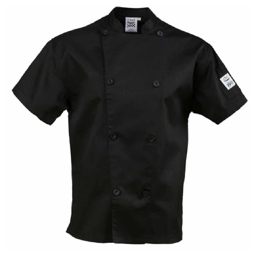 The John Ritzenthaler Company J205BK-L Chef Revival® Performance Series Jacket Large Double Breasted is an expertly crafted garment designed to meet the rigorous demands of professional kitchens. This chef jacket features a double-breasted design that not only enhances its traditional aesthetic but also provides a practical barrier against spills and splashes. The jacket is characterized by its large size and short sleeves, which offer comfort and ease of movement, essential for chefs during their busy shifts. It includes 8 distinctive chef logo buttons that add to its professional appearance. The incorporation of a traditional collar lends a classic touch, while the sleeve pocket offers convenient storage for small tools or notes. A mesh back ensures breathability, making it suitable for high-temperature kitchen environments. Constructed from a durable poly/cotton blend, this jacket offers the perfect balance of comfort and resilience. Its sleek black color provides a stylish yet practical uniform option for chefs. This garment is packaged individually, highlighting its exclusivity. The John Ritzenthaler Company J205BK-L is an ideal choice for culinary professionals seeking a blend of style, functionality, and durability in their workwear within various segments of the food service industry.