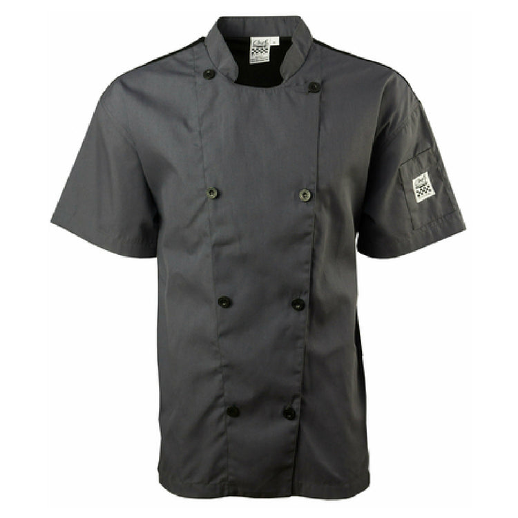 The John Ritzenthaler Company J205GR-M Chef Revival® Performance Series Jacket, Medium, is meticulously crafted to serve culinary professionals with both style and functionality. This medium-sized jacket is double-breasted, providing a traditional culinary aesthetic and offering practical benefits such as enhanced durability and a snug fit for busy kitchen environments. It features a classic collar that complements its professional look. The jacket is adorned with 8 chef logo buttons that not only enhance its visual appeal but also ensure secure fastening. With short sleeves, this jacket offers increased mobility and comfort, crucial for chefs in fast-paced settings. A convenient sleeve pocket adds practicality, allowing chefs to store essential small tools or notes. One of the jacket's standout features is its mesh back, designed to improve airflow and keep users cool, a significant advantage in hot kitchen conditions. Constructed from a poly/cotton blend, this pewter grey jacket combines the benefits of polyester's durability with cotton’s comfort, making it suitable for demanding culinary environments. The John Ritzenthaler Company J205GR-M is packed individually, ensuring quality and convenience for commercial kitchens, catering businesses, and culinary schools looking for reliable, high-performance attire for their staff.