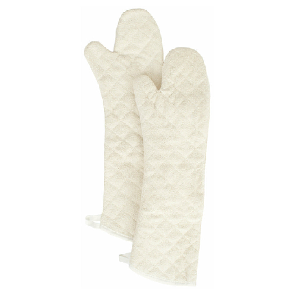 The John Ritzenthaler Company TTOM24BE Ritz® Oven Mitt Shoulder Length 24" is a meticulously designed kitchen essential for culinary professionals and home chefs who prioritize safety and performance. This oven mitt extends to a generous length of 24 inches, providing comprehensive protection for the entire arm up to the shoulder, which is particularly beneficial in high-temperature environments. It is engineered to withstand temperatures of up to 450°F, ensuring exceptional heat resistance. The mitt's silicone lining enhances its protective capabilities, offering an additional layer of safety against burns. Constructed from 100% terry, this oven mitt combines durability with comfort, making it a reliable kitchen companion. Its machine washable feature ensures easy maintenance and prolonged usability. Each pair is available in a classic beige color, catering to various aesthetic preferences in culinary spaces. The John Ritzenthaler Company TTOM24BE Ritz® Oven Mitt is an ideal choice for chefs in bustling restaurant kitchens and for catering professionals who require dependable heat protection. It is packed with convenience in mind, with 36 pairs per case, making it a practical option for those who need bulk quantities without compromising on quality and safety standards.