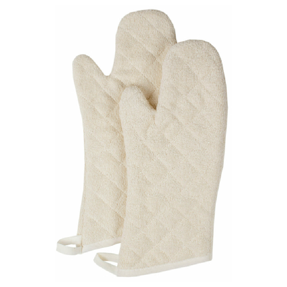 The John Ritzenthaler Company TTOM27BE Ritz® Oven Mitt Elbow Length 17" is meticulously crafted for culinary environments that demand both safety and comfort. With its robust elbow-length design, this oven mitt provides comprehensive protection up to 450°F, ensuring safety during high-temperature culinary operations. The mitt is constructed with a 100% terry exterior, providing a soft and absorbent texture that enhances grip and control. Internally, the silicone lining offers an extra layer of heat resistance, further safeguarding the wearer. This product is also machine washable, facilitating easy maintenance and longevity, a critical feature for busy professional kitchens. Each pair is packaged individually in a bag, and the product is available in a case packed with 36 pairs, making it a cost-effective solution for large-scale operations. The beige color adds a neutral, professional aesthetic to any kitchen setting. Ideal for chefs, bakers, and foodservice professionals, the TTOM27BE Ritz® Oven Mitt is a practical and reliable choice for ensuring hand safety in various cooking environments. Its thoughtful design and quality materials address the rigorous demands of commercial kitchens while offering comfort and protection in equal measure.