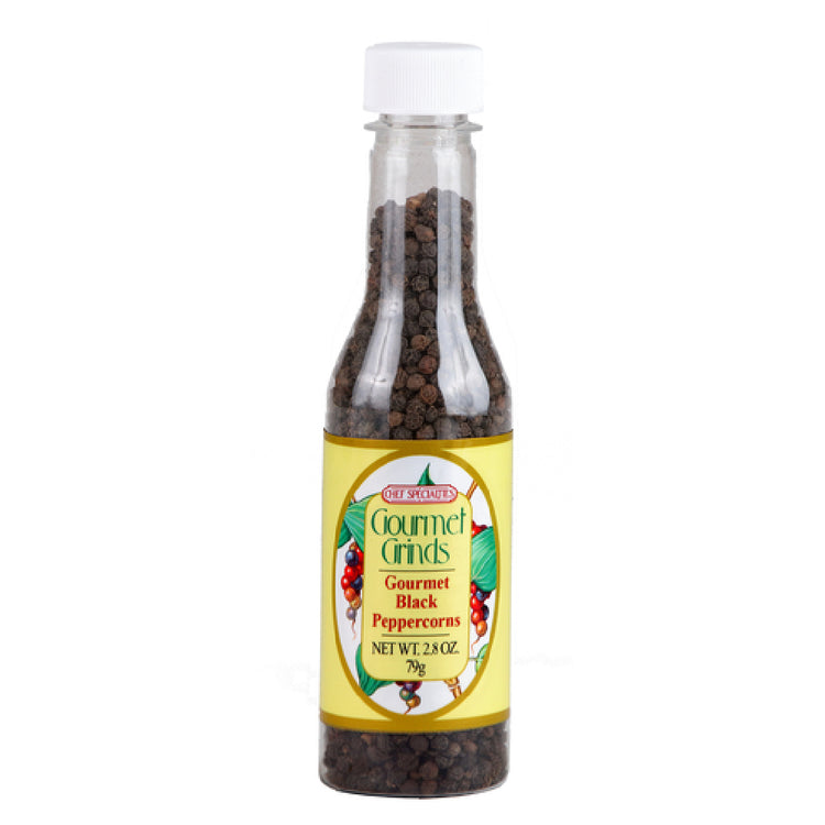 Chef Specialties 00501 (005015) Gourmet Grinds™ Malabar Black Peppercorns 2.8 Oz. stands out as a premium choice for culinary professionals and home chefs alike. Packaged in a 6-1/2" high PET bottle, this product guarantees both convenience and durability. The peppercorns are filled in the U.S.A., ensuring high standards of quality and freshness. The Malabar variety of black peppercorns is renowned for its robust flavor and aroma, making it an essential ingredient in kitchens that prioritize quality. Each bottle contains 2.8 oz. of these gourmet grinds, offering an ideal balance between quantity and usability for various culinary applications. This product is also available for purchase in quantities of 12, providing flexibility for both individual and bulk buyers, with the option to mix different spice varieties within a single case. This caters to restaurants, catering services, and food retailers who require diverse spice selections. Chef Specialties' commitment to quality and customer satisfaction is evident in the meticulous sourcing and packaging of these peppercorns, making them a reliable choice for enhancing the flavor profile of any dish. This product is a testament to the brand's dedication to delivering superior culinary essentials to diverse market segments.