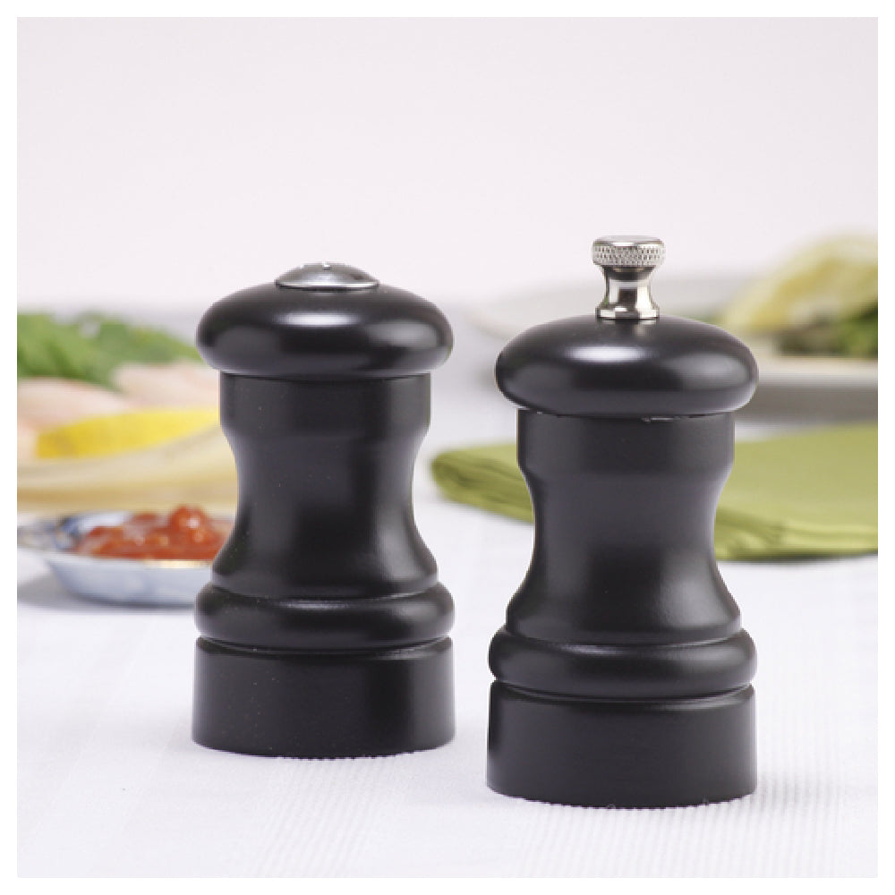 The Chef Specialties 04500 (045004) Chef Professional Series Capstan Pepper Mill / Salt Shaker Set is a meticulously crafted kitchen essential, standing 4 inches high and combining elegance with functionality. This set, made in the USA, features a rich ebony finish that complements any dining or kitchen decor. A standout feature of the pepper mill is its robust stainless steel grinding mechanism, ensuring durability and precise grinding performance, which is critical for professional chefs and culinary enthusiasts alike. The wood construction adds a touch of classic sophistication, while the lifetime warranty underscores the manufacturer’s commitment to quality and customer satisfaction. This set is particularly valuable for those in the culinary industry who seek reliable and aesthetically pleasing tools that enhance the dining experience. Suitable for a variety of market segments, from high-end restaurants to home kitchens, this set balances style with practicality, making it a versatile choice for anyone serious about their culinary tools.