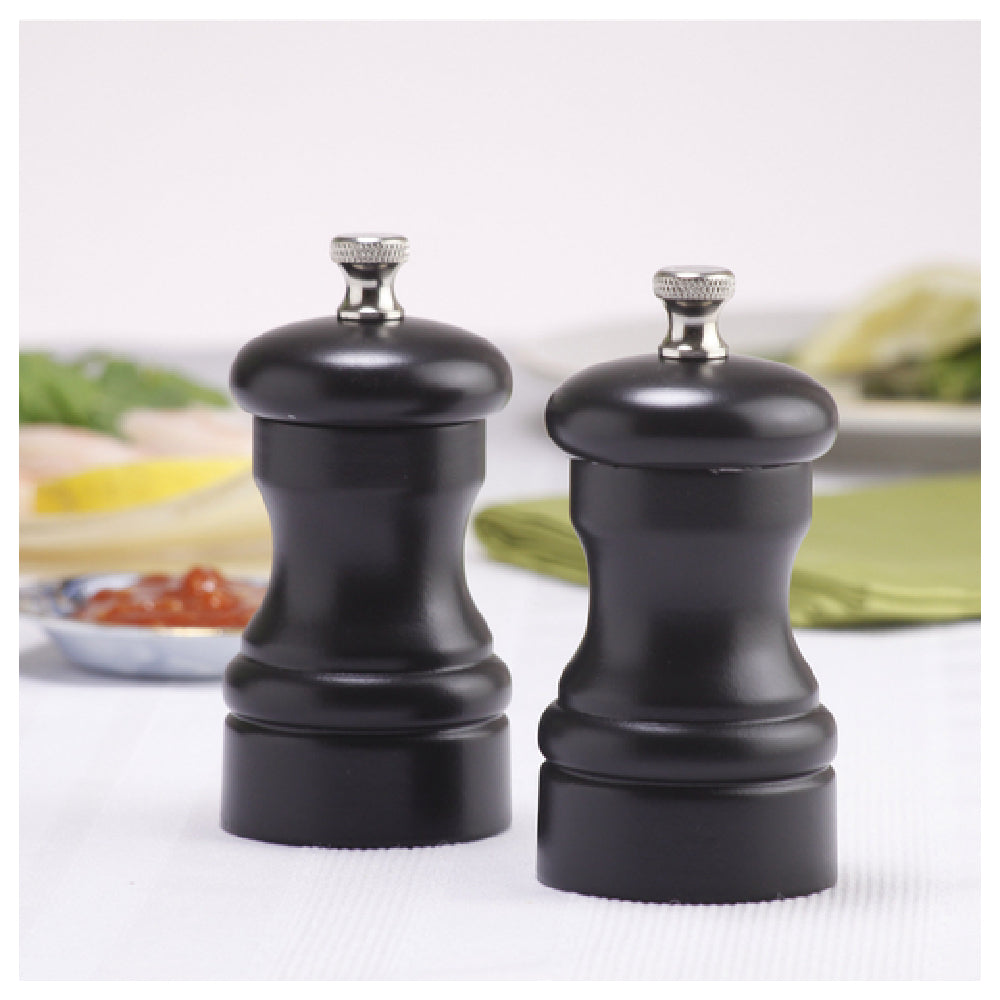 The Chef Specialties 04502 (045028) Chef Professional Series Capstan Salt Mill/Pepper Mill Set stands as a hallmark of craftsmanship and durability, tailored for culinary enthusiasts and professionals alike. Measuring 4 inches in height, this compact yet robust duo features a wood construction that exudes sophistication with its ebony finish. The set is thoughtfully engineered with a stainless steel pepper grinder, ensuring precise and effortless grinding for a variety of peppercorns. Complementing this is the ceramic salt grinding mechanism, known for its corrosion resistance and longevity, making it ideal for maintaining the purity of salt. Proudly made in the USA, this set is backed by a lifetime warranty, underscoring its commitment to quality and longevity. Whether in a bustling restaurant kitchen or a home gourmet setup, the Chef Specialties 04502 (045028) set delivers unparalleled performance and aesthetic appeal, catering to diverse market segments by combining traditional elegance with modern functionality.