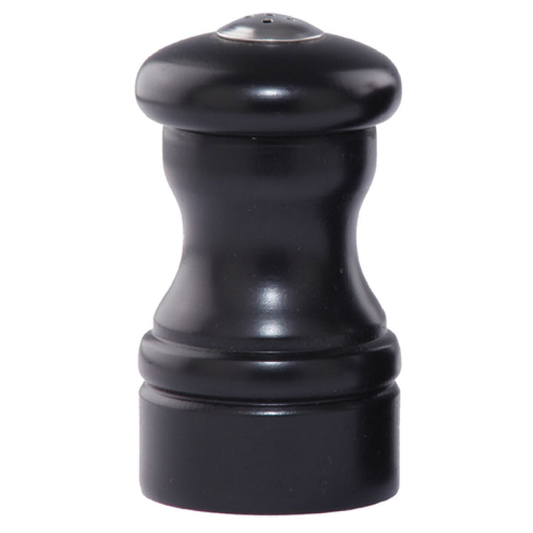 The Chef Specialties 04555 (045555) Chef Professional Capstan Salt/Pepper Shaker is a premium kitchen accessory designed for both home and professional culinary environments. Standing at 4 inches high, this shaker exemplifies craftsmanship with its elegant ebony finish, highlighting its visual appeal and making it a stylish addition to any table setting. Constructed from high-quality wood, it ensures durability and long-lasting performance. The shaker features a stainless steel shaker cap that is not only resistant to corrosion but also enhances the product's sophistication. A practical rubber plug is included for effortless refilling, ensuring convenience for busy chefs and home cooks alike. Made in the USA, this shaker demonstrates commitment to quality and domestic craftsmanship. It comes with a lifetime warranty, underscoring its durability and the manufacturer's confidence in its enduring quality. This shaker is particularly suited for gourmet chefs, restaurateurs, and culinary enthusiasts who prioritize functionality and elegance in their kitchen tools. The Chef Specialties 04555 shaker is a versatile and reliable choice for pepper and salt dispensing, promising a blend of style, durability, and practicality.