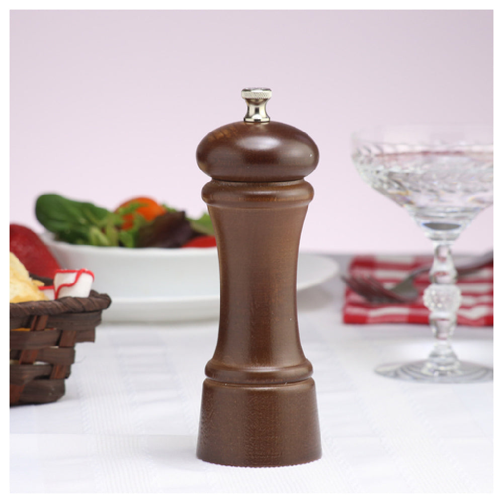 The Chef Specialties 06150 (061509) Chef Professional Series Elegance Pepper Mill is a sophisticated kitchen tool measuring 6 inches in height, designed to meet the diverse needs of culinary professionals and home chefs alike. This pepper mill showcases a refined walnut finish, adding a touch of elegance to any dining setting or kitchen workspace. Its stainless steel grinding mechanism ensures durability and precision in grinding, promising a consistently fine or coarse grind tailored to your specific culinary requirements. Proudly made in the USA, this pepper mill is crafted with quality and longevity in mind, backed by a lifetime warranty that underscores its enduring performance and reliability. The Chef Specialties Elegance Pepper Mill is particularly suited for upscale restaurants, catering services, and gourmet cooking enthusiasts who value both style and functionality in their kitchen equipment. Its compact size makes it a perfect fit for intimate dining experiences while ensuring ease of use and maintenance. This pepper mill stands out as a premium choice for those seeking a blend of aesthetic appeal and practical utility, enhancing the flavor and presentation of dishes through expertly ground pepper with every use.