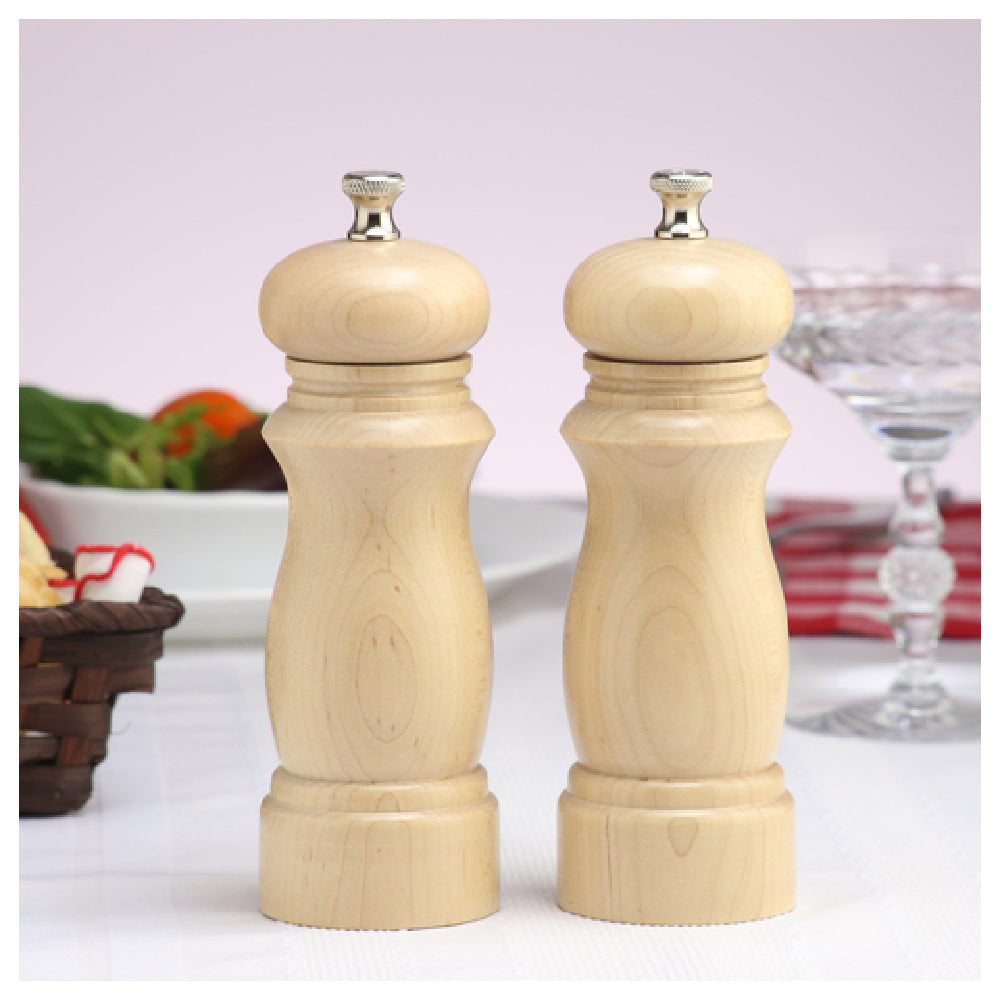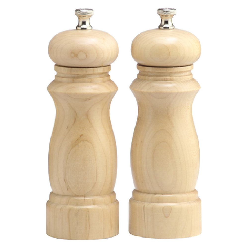 The Chef Specialties 06202 (062025) Chef Professional Series Salem Salt/Pepper Mill Set is a high-quality kitchen accessory designed for gourmet cooking enthusiasts and professional chefs alike. Standing at 6 inches tall, this set boasts a natural finish that complements any kitchen decor. The pepper mill features a sturdy stainless steel grinder, ensuring long-lasting durability and precise grinding performance. On the other hand, the salt mill is equipped with a ceramic grinding mechanism, which is perfect for delivering consistent results while preventing corrosion. Crafted with meticulous attention to detail, this set is proudly made in the USA and comes with a lifetime warranty, highlighting the manufacturer's confidence in its quality and durability. This combination of features makes it an ideal choice for various market segments, including home cooks, professional kitchens, and culinary schools, all seeking reliable and efficient seasoning tools. The Chef Specialties Salem Salt/Pepper Mill Set not only enhances the aesthetic appeal of your dining table but also ensures a superior seasoning experience, making it a valuable addition to any culinary setting.