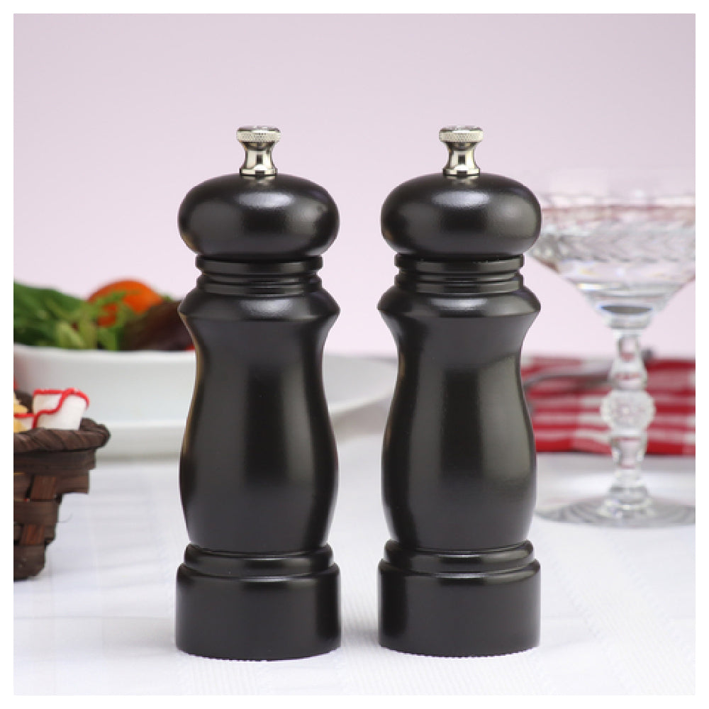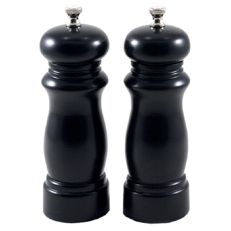The Chef Specialties 06302 - 063022 Chef Professional Series Salem Salt Mill/Pepper Mill Set stands out in both performance and design, catering to culinary professionals and home chefs alike. Measuring 6 inches in height, this set features a sophisticated ebony finish, enhancing any kitchen's aesthetic. The set includes a stainless steel pepper grinder known for its durability and efficiency, providing a consistent grind that is essential for professional kitchens. Complementing this is the ceramic salt grinding mechanism, which is resistant to corrosion, ensuring longevity and maintaining the purity of the salt's flavor. This set is proudly made in the USA, reflecting a commitment to quality craftsmanship. Additionally, both mills come with a lifetime warranty, underscoring their reliability and the manufacturer's confidence in their performance. Suitable for use in various market segments, from upscale restaurants to home cooking enthusiasts, the Salem Salt Mill/Pepper Mill Set delivers a blend of durability, style, and precision grinding. Its technical specifications and elegant design make it a valuable addition to any culinary setting, promising consistent performance and satisfaction for years to come.