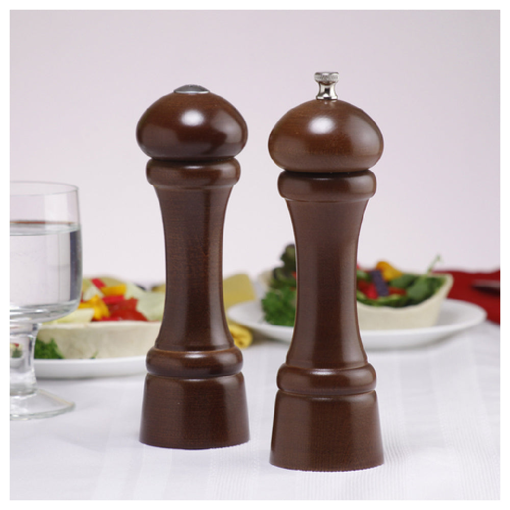 The Chef Specialties 08100 (081002) Chef Professional Series Windsor Salt Shaker/Pepper Mill Set stands at an impressive 8 inches high and features a refined walnut finish, making it an elegant addition to any kitchen or dining table. This set is a perfect blend of form and function, designed for both home cooks and professional chefs who appreciate quality craftsmanship. At its core, the set boasts a stainless steel grinding mechanism, emphasizing durability and efficiency in grinding peppercorns to the perfect consistency. Proudly made in the USA, this product is a testament to superior American manufacturing, ensuring each piece meets high-quality standards. The lifetime warranty further underscores the brand's commitment to excellence and customer satisfaction. This set is particularly appealing to culinary professionals and cooking enthusiasts who desire reliable, long-lasting tools that enhance their culinary creations. By combining aesthetic appeal with functional prowess, the Chef Specialties 08100 set caters to a diverse array of markets, including upscale restaurants, gourmet kitchens, and home dining settings, where both performance and presentation are paramount.