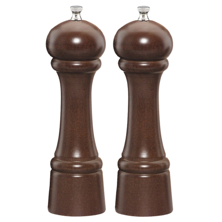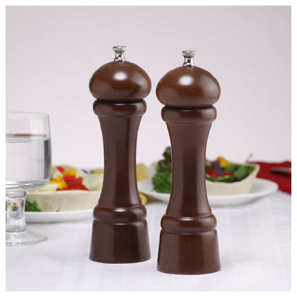 The Chef Specialties 08102 (081026) Chef Professional Series Windsor Salt Mill/Pepper Mill Set is an expertly crafted kitchen tool, perfect for culinary professionals and enthusiasts alike. Standing at 8 inches high, this set features a distinguished walnut finish that adds a touch of elegance to any dining table or kitchen counter. The pepper mill is equipped with a stainless steel pepper grinder, ensuring durability and consistent performance, while the salt mill employs a ceramic grinding mechanism, known for its corrosion resistance and longevity. Proudly made in the USA, this set reflects a commitment to quality and craftsmanship. Furthermore, it is backed by a lifetime warranty, underscoring the manufacturer's confidence in its enduring performance. The Chef Professional Series Windsor Set delivers precise seasoning control, catering to the needs of chefs seeking reliability and precision in their culinary creations. Its classic design and robust construction make it a versatile choice for both home kitchens and professional dining establishments, offering a timeless appeal and functionality that meets the demands of various market segments within the food industry.