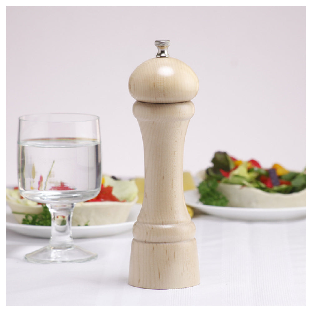 Chef Specialties 08252 (082528) Chef Professional Series Windsor Salt Mill 8" High is a meticulously crafted kitchen tool that exemplifies both form and function. Standing at an impressive 8 inches, this salt mill is constructed from high-quality wood, ensuring both durability and aesthetic appeal. It features a robust and enduring grinding mechanism, specifically designed to withstand the rigors of professional and home kitchens alike, providing consistent performance over time. The natural finish of the Windsor Salt Mill complements a variety of kitchen décors, making it a versatile addition to any culinary environment. Proudly made in the USA, this salt mill underscores a commitment to quality craftsmanship. The product comes with a lifetime warranty, offering assurance of its long-lasting reliability and superior functionality. Suitable for chefs, culinary enthusiasts, and food service professionals, the Chef Specialties Windsor Salt Mill is designed to enhance the culinary experience by delivering perfectly ground salt with every use. Its combination of durability, aesthetic design, and dependable performance makes it an invaluable tool for diverse market segments, from high-end restaurants to home gourmet kitchens, where precision and quality are paramount.