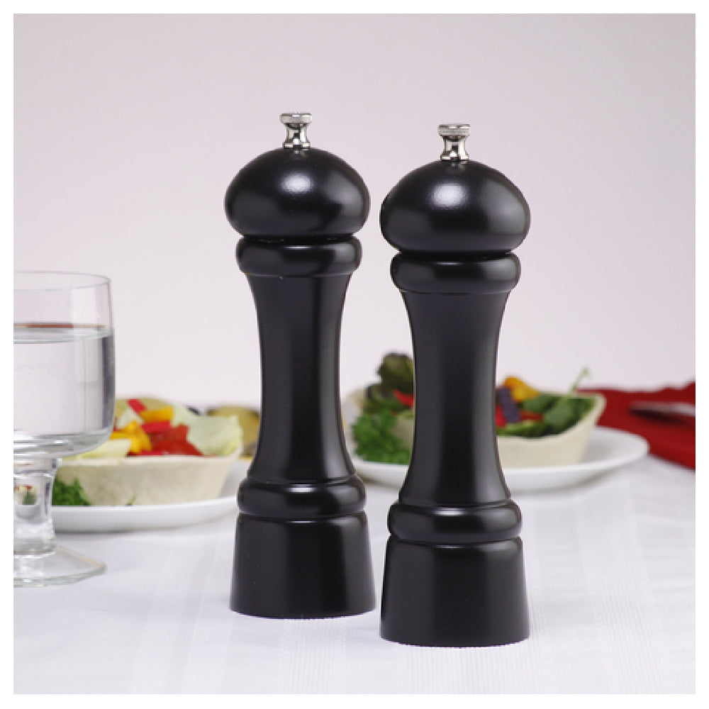 The Chef Specialties 08302 - 083020 Chef Professional Series Windsor Salt Mill/Pepper Mill Set stands out as a sophisticated duo, combining classic design with high-performance functionality. At 8 inches high, these mills are ideal for both professional chefs and home cooking enthusiasts. The set features an elegant ebony finish, providing a striking contrast to any kitchen décor. The stainless steel pepper grinder is engineered for precision, ensuring a consistent grind that enhances the flavor of your dishes. Complementing this, the ceramic salt grinding mechanism provides durability and resistance to corrosion, retaining its efficiency even with the use of moist sea salts. Both mills are proudly made in the USA, reflecting outstanding craftsmanship and a commitment to quality. Additionally, the lifetime warranty assures customers of their long-term reliability and performance. This set is a perfect choice for culinary professionals who demand excellence and durability in their kitchen tools, as well as for food enthusiasts looking to elevate their culinary experience with precision seasoning instruments. The Chef Specialties Windsor Set is not merely a kitchen accessory but a testament to quality and functionality, designed to meet the diverse needs of the culinary industry.