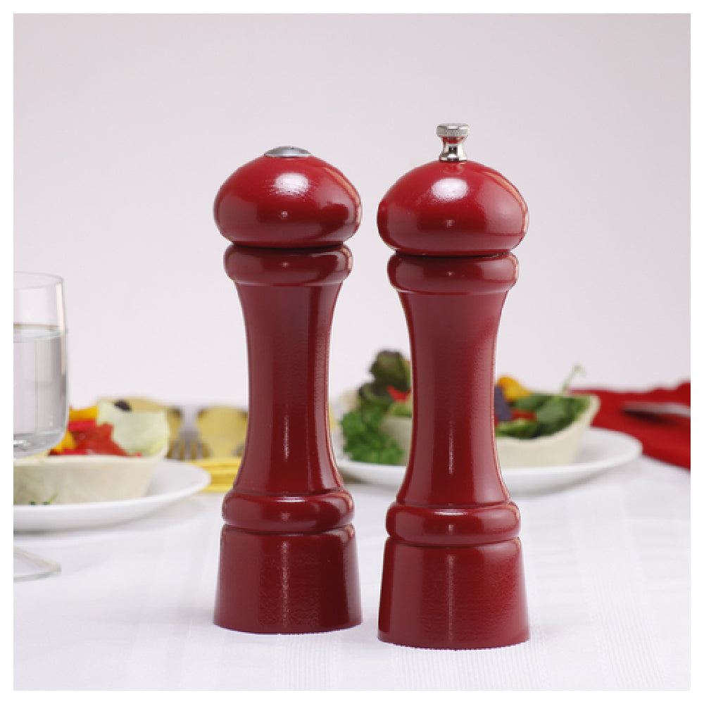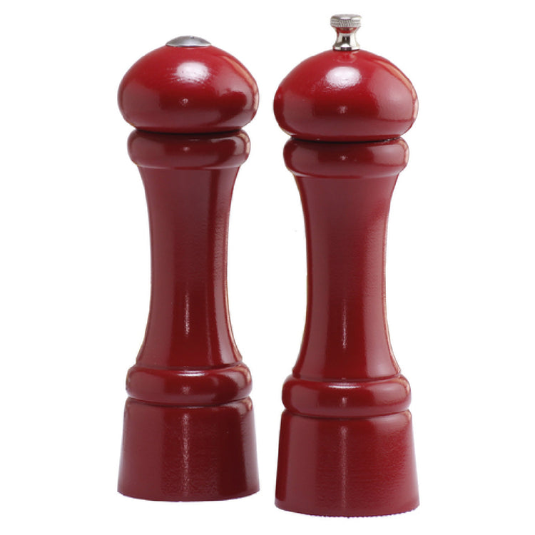 The Chef Specialties 08600 (086007) Autumn Hues Professional Pepper Mill & Salt Shaker Set is a premium culinary tool designed for both professional chefs and home cooking enthusiasts. Standing at an impressive 8 inches high, this set is crafted from quality wood, which is not only aesthetically pleasing but also durable. The pepper mill features a tempered stainless steel gear, ensuring long-lasting performance and precise grinding, a crucial aspect for any culinary expert. The set is proudly made in the USA, reflecting a commitment to superior craftsmanship. An added benefit is its lifetime warranty, a testament to its durability and quality assurance. The vibrant candy apple red finish adds a dash of color to any kitchen environment, making it not just a functional tool but also a decorative piece. This set caters to various market segments within the culinary industry, from high-end restaurants to households seeking reliable and stylish kitchen accessories. Its combination of technical precision and aesthetic appeal makes the Chef Specialties 08600 (086007) set a standout choice for those looking to enhance their cooking experience with a touch of elegance and dependable performance.