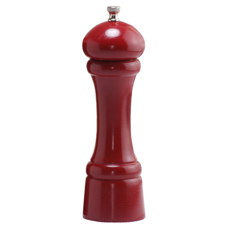 The Chef Specialties 08651 (086519) Autumn Hues Professional Pepper Mill - 8" High Wood is a distinguished kitchen tool, crafted to meet the rigorous demands of culinary professionals and home chefs alike. Standing at an 8-inch height, this pepper mill is designed with precision engineering featuring a tempered stainless steel gear, ensuring durability and consistent grinding performance. Its exterior boasts a striking candy apple red finish, which complements a wide range of kitchen decors while adding a touch of vibrant elegance to culinary settings. Proudly made in the USA, this pepper mill exemplifies high-quality craftsmanship and materials. It is backed by a lifetime warranty, reflecting the manufacturer's confidence in its enduring quality and reliability. The wood construction not only offers a sophisticated aesthetic but also provides a comfortable and robust grip, enhancing the user experience during grinding. This pepper mill is particularly appealing to those seeking a blend of functionality and style, making it a valuable addition for gourmet chefs, culinary enthusiasts, and anyone who values precision seasoning in their dishes. Its unique value proposition lies in its combination of aesthetic appeal, durable construction, and reliable performance, catering to diverse market segments within the culinary industry.