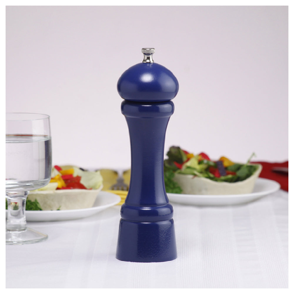 The Chef Specialties 08752 (086523) Autumn Hues Professional Salt Mill stands at 8 inches high and is crafted from wood, showcasing a stylish cobalt blue finish. Designed for culinary professionals and home cooking enthusiasts alike, this salt mill is equipped with a ceramic grinding mechanism, ensuring durability and a consistent grind quality. The ceramic grinder is resistant to corrosion, making it particularly suitable for salt, and offers a lifetime warranty, reflecting the manufacturer’s commitment to quality and longevity. Proudly made in the USA, this salt mill combines functionality with aesthetic appeal, making it a standout addition to any kitchen. Its ergonomic design allows for easy handling, while the vivid blue hue adds a touch of elegance and seasonal charm, aligning with the autumn hues theme. Perfect for gourmet chefs seeking precision and reliability, as well as for everyday kitchen use, this salt mill promises to deliver a superior grinding experience. Its robust construction and premium materials cater to diverse market segments looking for both practicality and style in their kitchen tools.