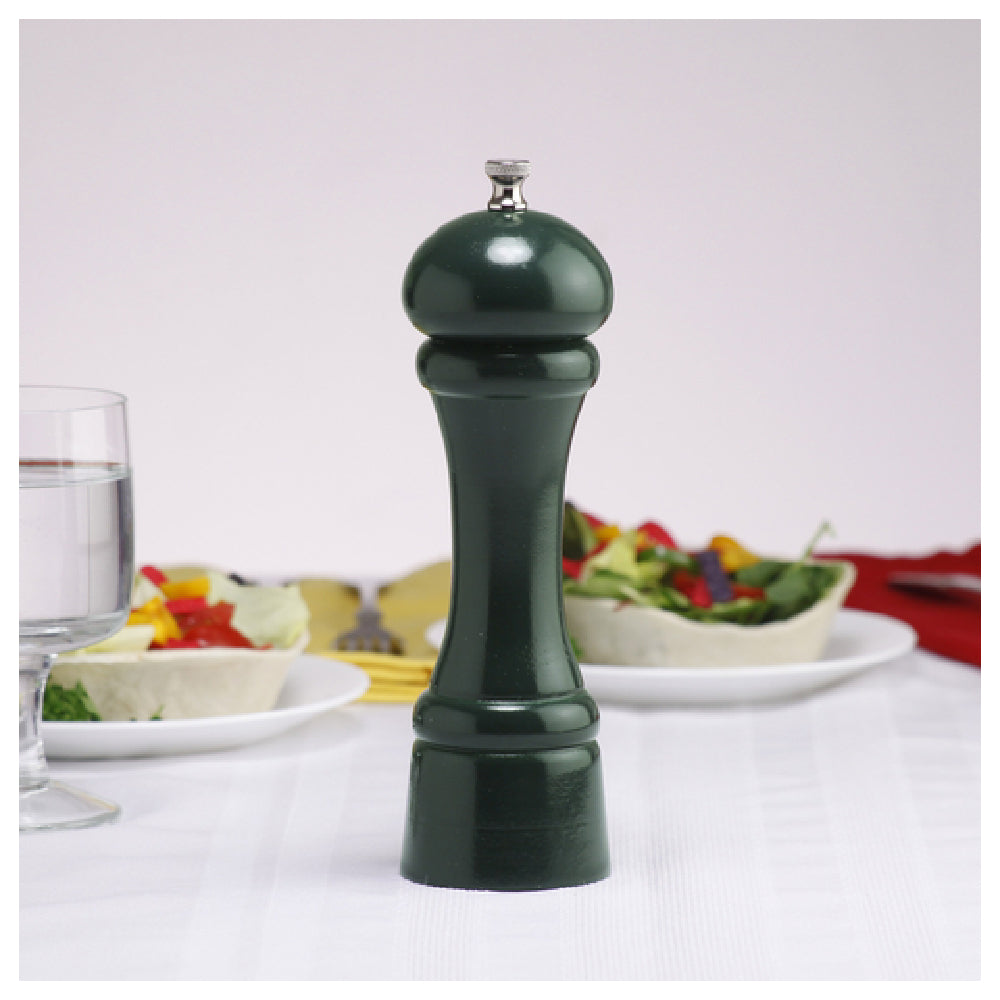 The Chef Specialties 08851 (088513) Autumn Hues Professional Pepper Mill stands out as a premium kitchen tool designed for both professional chefs and home cooking enthusiasts. This pepper mill features an 8-inch height, providing an optimal size for handling and ease of use. Crafted from high-quality wood, it embodies durability and elegance, making it a perfect addition to any kitchen décor. The pepper mill is equipped with a tempered stainless steel gear, ensuring consistent and efficient grinding of peppercorns. Finished in a distinctive forest green color, it adds a touch of sophistication and style to your culinary setup. Proudly made in the USA, this pepper mill comes with a lifetime warranty, reflecting its superior quality and the manufacturer's confidence in its longevity. It caters to various market segments, including professional kitchens and domestic settings, offering a reliable grinding solution that enhances the flavor and aroma of your dishes. This pepper mill is not just a functional tool but a statement piece that combines aesthetic appeal with practical utility, making it a valuable asset for any culinary enthusiast. Its robust construction and timeless design ensure that it remains a staple in your kitchen for years to come.
