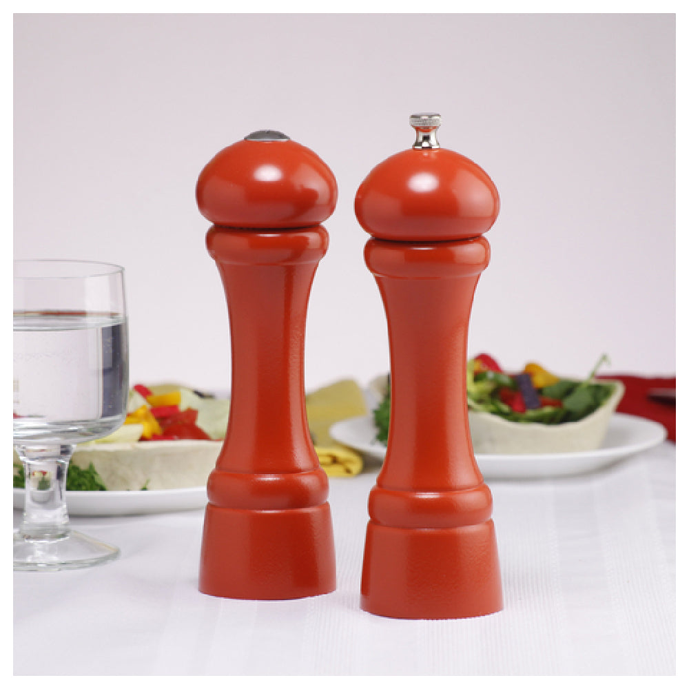 The Chef Specialties 08900 (089008) Autumn Hues Professional Pepper Mill & Salt Shaker Set stands as a testament to quality craftsmanship and elegant design, appealing to both professional chefs and home cooking enthusiasts. Measuring 8 inches high, this set is crafted from premium wood and features a vibrant butternut orange finish, adding a touch of autumnal charm to any kitchen decor. The pepper mill is equipped with tempered stainless steel gears, ensuring durability and precision in every grind. Proudly made in the USA, this set not only embodies superior quality but also supports local manufacturing. It is backed by a lifetime warranty, offering peace of mind and a long-term investment in culinary excellence. This set is ideal for a variety of market segments, including upscale dining establishments seeking to enhance their table settings, culinary schools looking for durable tools for budding chefs, and home cooks who value aesthetic and functional kitchen accessories. The combination of high-quality materials, meticulous construction, and a stylish design underscores the unique value proposition of this pepper mill and salt shaker set, making it a distinguished addition to any culinary toolkit.