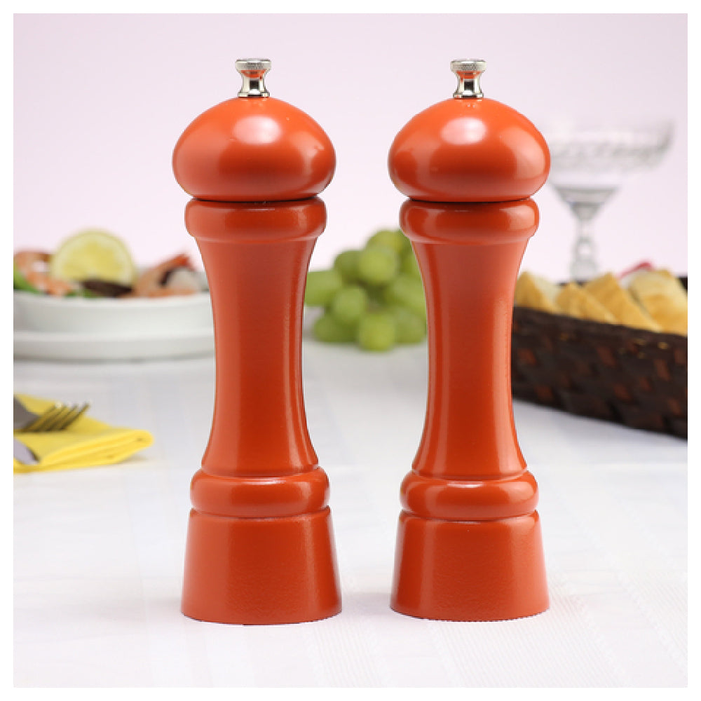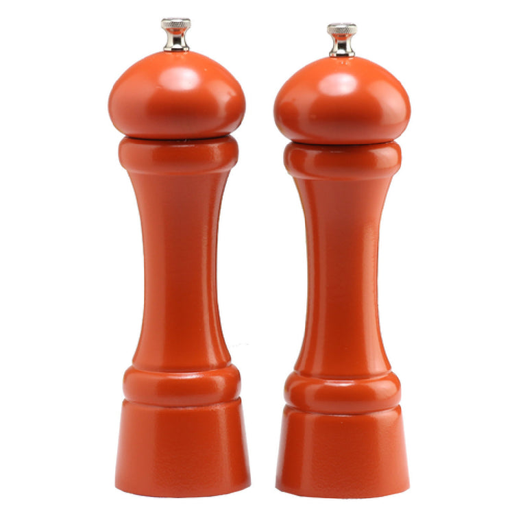 The Chef Specialties 08902 (089022) Autumn Hues Professional Pepper Mill & Salt Mill Set is a distinguished addition to any culinary setting, boasting an impressive 8-inch height that balances functionality and aesthetics. Crafted from premium wood, this set is finished in a captivating butternut orange, offering a touch of seasonal elegance to kitchens or dining areas. At the heart of its performance are the tempered stainless steel gear and ceramic grinding mechanism, which ensure precise, consistent grinding for both salt and pepper, enhancing the flavors of any dish. Proudly made in the USA, this set embodies quality and craftsmanship, further reinforced by a lifetime warranty that guarantees enduring performance and peace of mind. Ideal for home cooks and professional chefs alike, this set provides a reliable, stylish solution for seasoning needs, making it a versatile choice across various market segments within the culinary industry. Whether for personal use or as a thoughtful gift, the Chef Specialties 08902 set offers a unique blend of design and durability, making it an indispensable tool for those passionate about cooking and dining.
