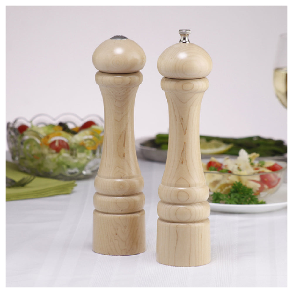 The Chef Specialties 10200 (102004) Chef Professional Series Imperial Salt Shaker/Pepper Mill Set is a premium culinary tool, designed to enhance the seasoning experience for both professional chefs and home cooks. Standing at an impressive 10 inches high, this set is crafted with a natural finish that exudes elegance and complements any kitchen decor. The standout feature of this set is its stainless steel grinding mechanism, renowned for its durability and precision in delivering perfectly ground salt and pepper. Made in the USA, this set underscores a commitment to superior craftsmanship and quality. Furthermore, Chef Specialties backs this product with a lifetime warranty, providing peace of mind and underscoring its long-term value. This set is ideally suited for various market segments, including gourmet restaurants looking for reliable kitchen tools, as well as home cooking enthusiasts who appreciate high-quality, American-made kitchenware. Its combination of aesthetic appeal, functional excellence, and robust construction makes it a distinguished choice for those seeking to elevate their culinary creations. The Chef Specialties 10200 (102004) set truly stands as a testament to the art of seasoning, blending form and function seamlessly.