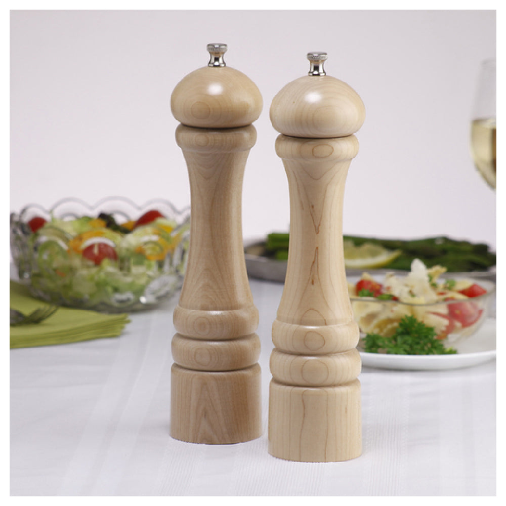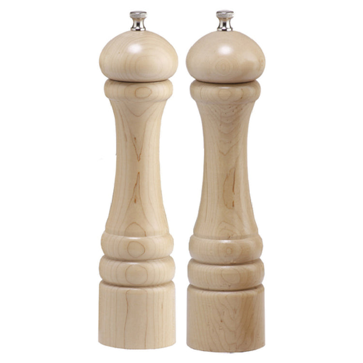 Chef Specialties 10202 (102028) Chef Professional Series Imperial Salt Mill/Pepper Mill Set is a distinguished kitchen accessory, standing 10 inches high with a natural finish that complements any culinary environment. This set features a stainless steel pepper grinder, ensuring durability and a consistently smooth grinding experience. The ceramic salt grinding mechanism adds a modern touch, providing resistance to corrosion and delivering precision for various salt textures. Made in the USA, this mill set exemplifies quality craftsmanship and reliability, backed by a lifetime warranty, guaranteeing long-term satisfaction and performance. The Chef Professional Series Imperial Salt Mill/Pepper Mill Set is ideal for professional chefs and home cooking enthusiasts alike, offering a harmonious blend of design and functionality. Its elegant aesthetics and robust construction make it a valuable addition to any gourmet setting, enhancing the seasoning process with style and efficiency. This set is particularly beneficial for those who appreciate high-quality kitchen tools that offer both practical use and aesthetic appeal.