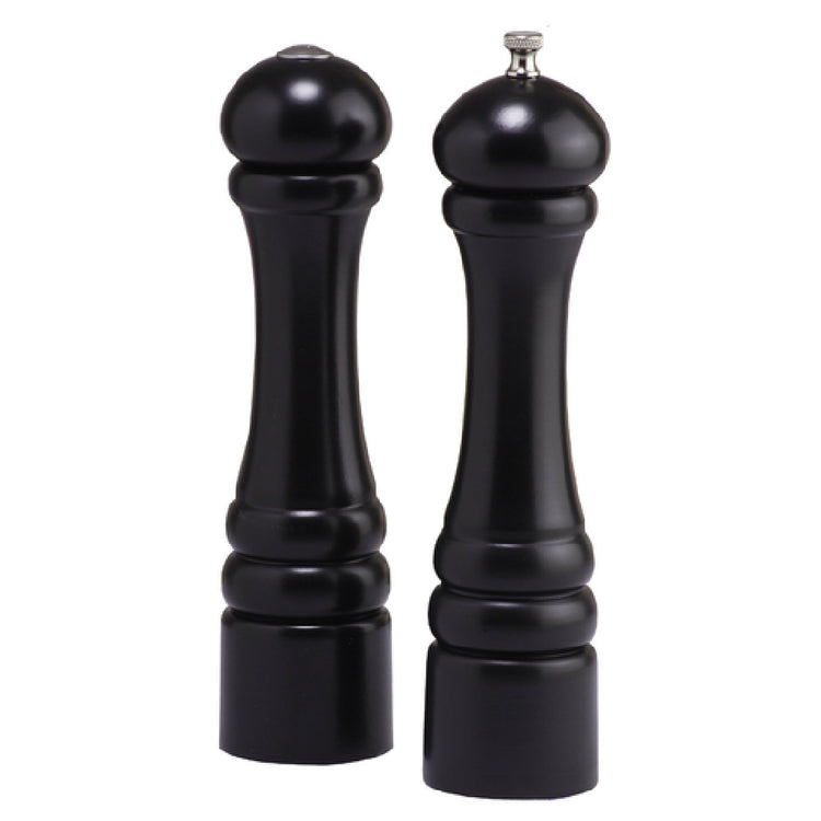 Chef Specialties 10500 (105005) Chef Professional Series Imperial Salt Shaker/Pepper Mill Set - This exquisite 10-inch tall set is a perfect blend of functionality and elegance, crafted in the USA with an ebony finish that adds a touch of sophistication to any kitchen or dining setting. The set comprises a salt shaker and a pepper mill, each constructed from quality wood, ensuring durability and a classic aesthetic appeal. The pepper mill features a stainless steel grinding mechanism, renowned for its precision and longevity, making it an essential tool for professional chefs and home cooking enthusiasts alike. The lifetime warranty underscores the commitment to quality and customer satisfaction, providing peace of mind for users who seek reliable kitchen tools. Tailored for a range of market segments, from upscale restaurants to home gourmet kitchens, the 10500 series delivers exceptional performance and aesthetic value, making it an indispensable addition to culinary environments that appreciate fine craftsmanship and reliable functionality.