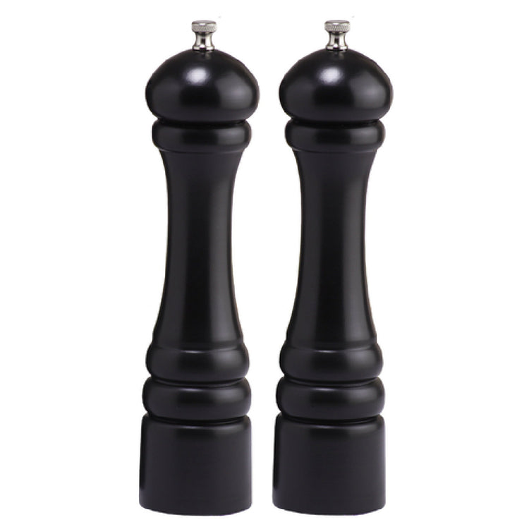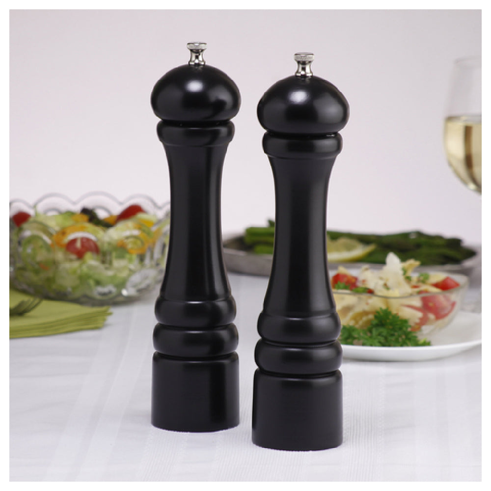 The Chef Specialties 10502 (105029) Chef Professional Series Imperial Salt Mill/Pepper Mill Set stands as a hallmark of quality and precision in culinary tools. Measuring 10 inches high, this set is finished in a sleek ebony, making it a sophisticated addition to any kitchen decor. The pepper mill is equipped with a stainless steel grinder, ensuring durability and a consistently fine grind. In contrast, the salt mill features a ceramic grinding mechanism, which is specifically designed to prevent corrosion and provide a precise grind. Proudly made in the USA, this set promises longevity and reliability, supported by a lifetime warranty that underscores its exceptional craftsmanship. This combination of materials and design not only enhances functionality but also opens up diverse market appeal—catering to professional chefs who demand precision and durability, as well as home cooks who value elegance and ease of use. The Chef Professional Series Imperial Salt Mill/Pepper Mill Set is ideal for diverse culinary environments ranging from high-end restaurants to personal kitchens, effectively bridging the gap between professional-grade performance and stylish, user-friendly design.
