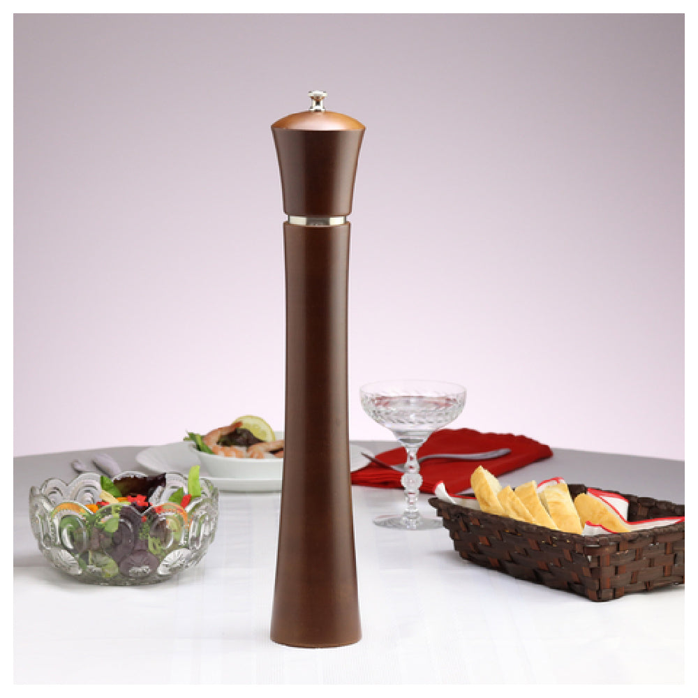 The Chef Specialties 17882 (178825) Chef Professional Series Pueblo Cafe Salt Mill stands at an impressive 17 inches high, making it a striking addition to any kitchen or dining setting. Crafted from premium wood with a rich mocha finish, it exudes elegance and sophistication, complemented by a sleek stainless steel accent that adds a modern touch. This salt mill is equipped with a ceramic grinding mechanism, ensuring a smooth and consistent grind every time, perfect for culinary professionals and cooking enthusiasts alike. Its robust construction and high-quality materials guarantee durability and longevity, supported by a lifetime warranty that underscores its exceptional craftsmanship. Proudly made in the USA, the Chef Specialties 17882 salt mill is not only a functional kitchen tool but also a statement piece that enhances the aesthetic of any culinary space. Ideal for various market segments, from high-end restaurants to home kitchens, it caters to those who value both performance and style in their kitchen accessories.