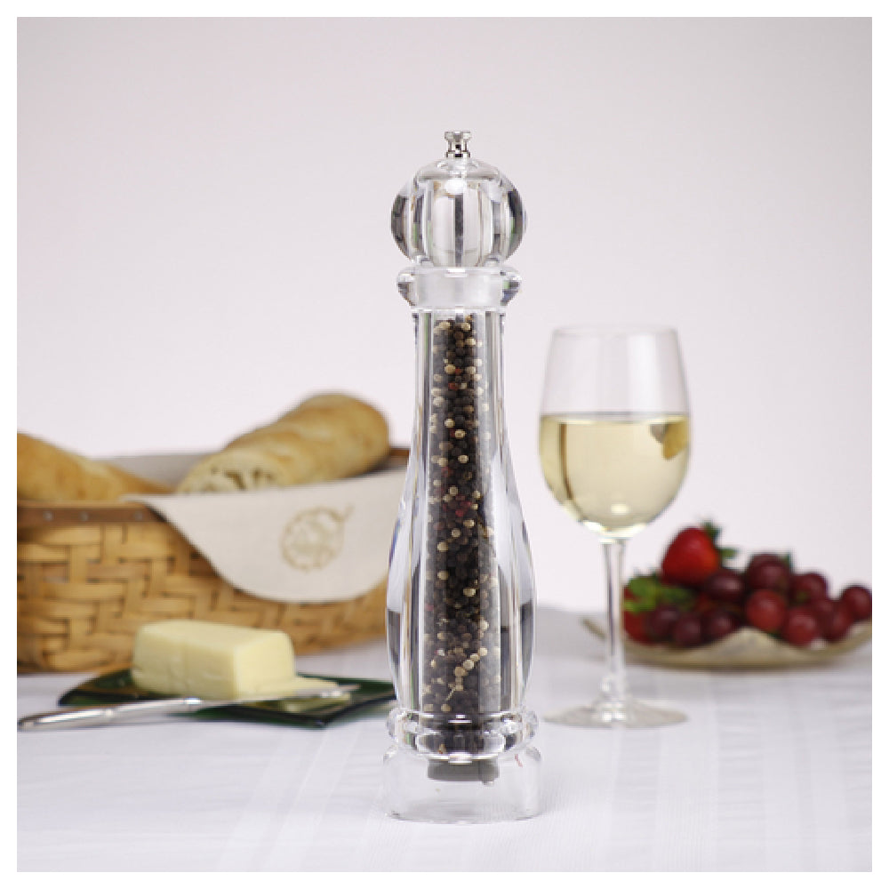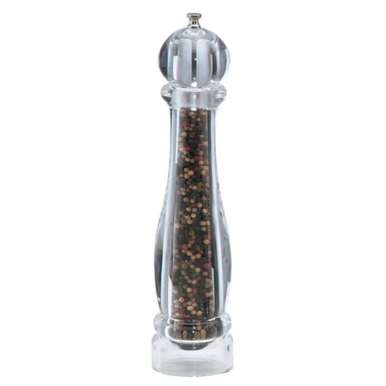 The Chef Specialties 29612 (296123) Chef Professional Series Ultima Pepper Mill 12" High stands out as a distinguished tool in the culinary world, designed for chefs and cooking enthusiasts seeking precision and durability. This pepper mill features a stainless steel grinding mechanism, renowned for its resilience against wear and its ability to deliver consistently uniform grinds. The clear acrylic body not only gives it a sleek, modern appearance but also allows users to easily monitor pepper levels, ensuring they never run out during critical kitchen operations. Being pre-filled in the U.S.A., it guarantees a ready-to-use product that meets high quality standards right out of the package. The pepper mill is further distinguished by its lifetime warranty, a testament to its exceptional build quality and the manufacturer’s confidence in its long-lasting performance. At 12 inches high, it is an ideal choice for both commercial kitchens and home gourmets, providing ample capacity for frequent use. Whether for professional chefs needing dependable tools or home cooks wanting to elevate their spice dispensing experience, the Chef Specialties 29612 Ultima Pepper Mill offers a compelling blend of functionality, style, and reliability.