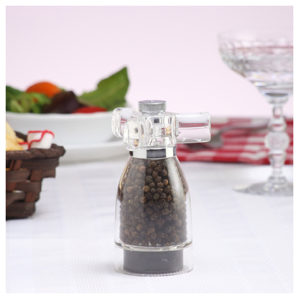The Chef Specialties 29931 (299315) Chef Home Cookin' Series Spinner Pepper Mill With Handle Top is a uniquely designed kitchen accessory that combines functionality with aesthetic appeal. Standing at 4-1/2 inches high, it boasts a clear acrylic body complemented by stainless steel accents, offering a sleek and modern look suitable for any culinary setting. The pepper mill includes a handle top, promoting ease of use and ergonomic handling during meal preparation. Central to its operation is a ceramic grinding mechanism, renowned for its durability and efficiency in producing a consistent grind. This product is pre-filled in the USA, ensuring quality and convenience for users right out of the box. Chef Specialties backs the craftsmanship and longevity of this pepper mill with a lifetime warranty, reflecting the brand's commitment to quality. This makes the 29931 model not only a stylish addition to home kitchens but also a reliable tool for professional chefs seeking precision and endurance in their culinary tools. Ideal for both home cooks and industry professionals, it provides a perfect blend of style, performance, and reliability.