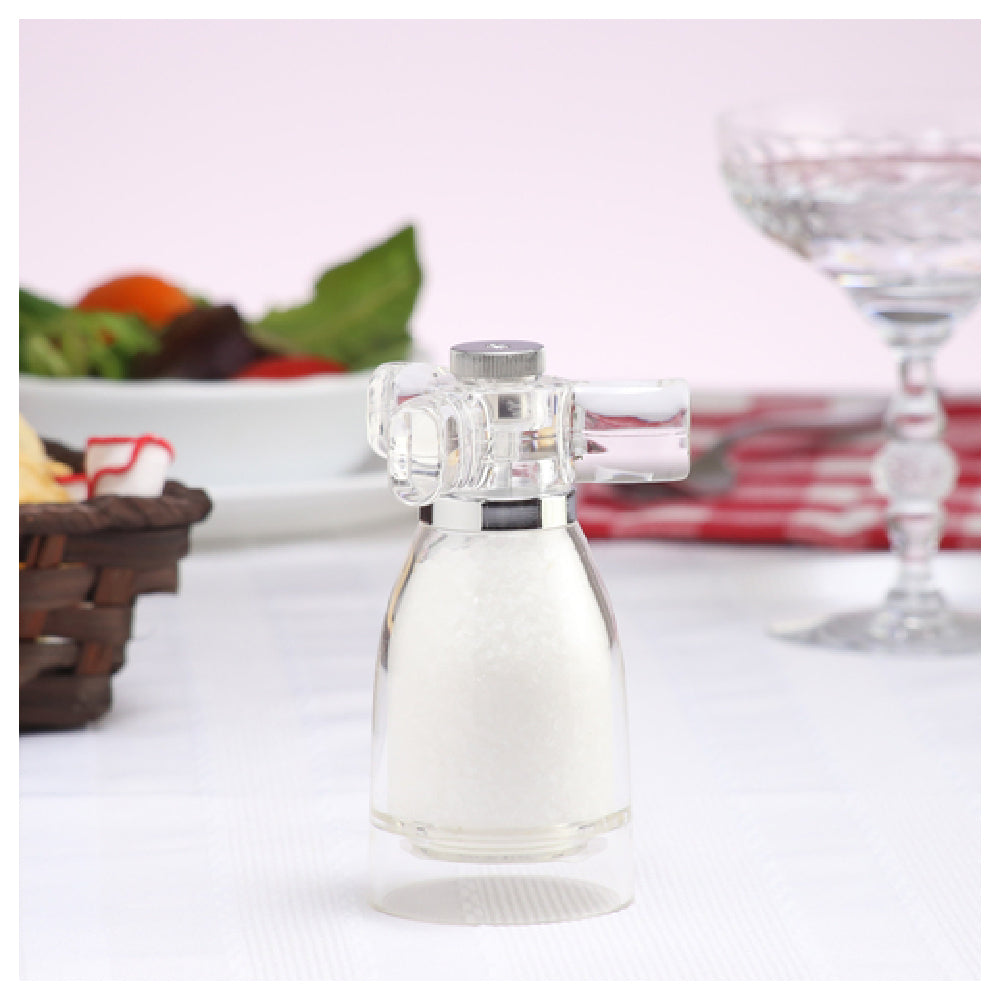 The Chef Specialties 29932 (299322) Chef Home Cookin' Series Spinner Salt Mill With Handle Top is a meticulously crafted kitchen tool designed to enhance culinary precision. Standing at 4-1/2 inches high, this salt mill is made from clear acrylic, beautifully accented with stainless steel, offering both durability and aesthetic appeal for professional and home chefs alike. Its ceramic grinding mechanism is engineered for long-lasting performance, ensuring consistent and precise salt dispensing with every use. This feature is particularly valuable in professional culinary settings where precision seasoning is essential. The design includes a convenient handle top, allowing for effortless operation and control, catering to users who value functionality and ease of use. Filled in the U.S.A, this product underscores a commitment to quality and local craftsmanship, appealing to markets that prioritize domestic production. An outstanding lifetime warranty further enhances its value proposition, providing users with confidence in their investment. The Chef Specialties 29932 salt mill is an ideal choice for culinary enthusiasts and professionals who require reliable, high-quality kitchen tools that combine technical excellence with user-friendly design.