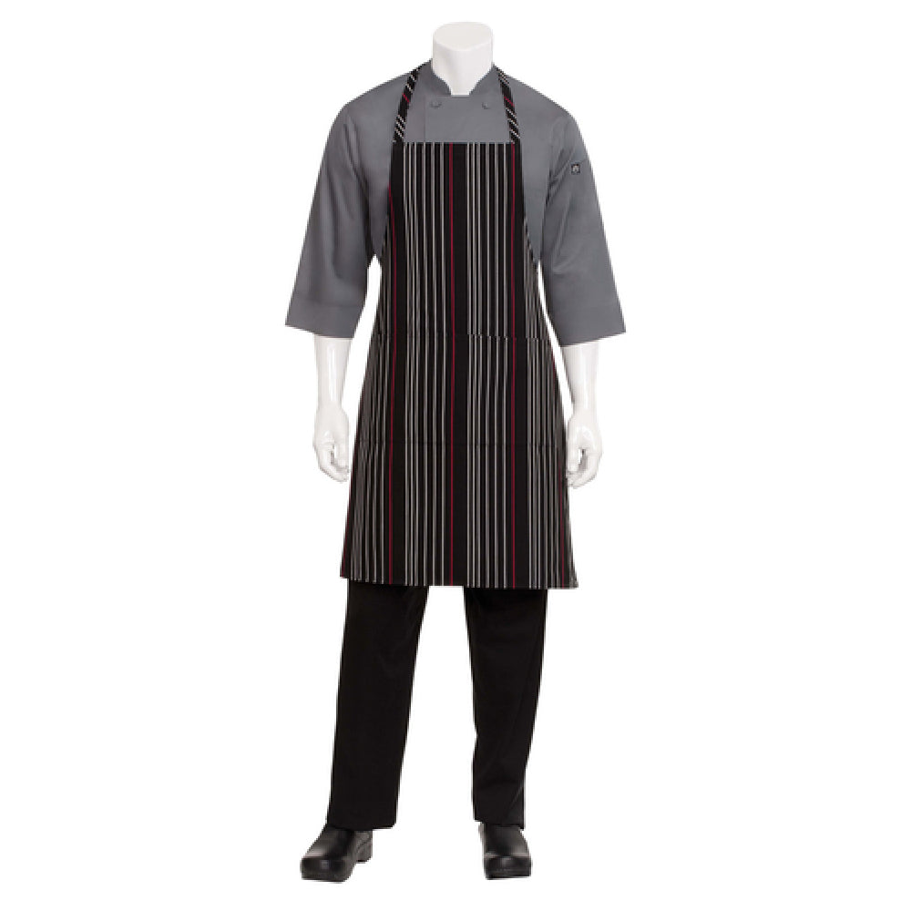 The Chef Works A550-BWR-0 Bib Apron is a meticulously designed garment tailored for the culinary industry, featuring a size of 34-1/4 inches in length and 27 inches in width. This apron is crafted from a durable 65/35 yarn-dyed poly/cotton blend, ensuring both comfort and resilience in demanding kitchen environments. The fabric's composition combines the breathability of cotton with the strength and wrinkle resistance of polyester, making it ideal for long shifts. A standout feature of this apron is its patch pocket with a center divide, providing convenient storage for utensils, recipes, or other essentials, enhancing efficiency in a bustling kitchen. The apron’s aesthetic appeal is elevated by its black, white, and red stripes, offering a stylish yet professional look suitable for various culinary settings. This practical and visually appealing design makes the Chef Works A550-BWR-0 Bib Apron a versatile choice for chefs, line cooks, and kitchen staff across different market segments, including high-end restaurants, catering services, and culinary schools. Its robust construction and thoughtful design details underscore its position as a valuable tool for kitchen professionals seeking durability and functionality.