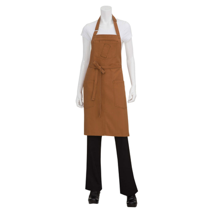 The Chef Works ABKV053-NTM-0 Rockford Bib Apron - an ideal choice for culinary professionals seeking both style and utility - combines practical design with high-quality materials. Measuring 34 inches in length and 30 inches in width, this apron provides ample coverage and protection in bustling kitchen environments. The adjustable metal neck buckle allows for a customized fit, ensuring comfort during extended wear. Crafted from 100% cotton, the apron features enzyme-washed canvas in a distinctive nutmeg color, adding a touch of sophistication to its functionality. Designed with a focus on utility, it includes a chest pocket equipped with a dedicated tweezer pocket, offering chefs convenient access to essential tools. Additionally, hip pockets with saddle stitching detail provide extra storage for culinary implements or personal items. This apron is particularly suited for chefs, culinary students, and kitchen staff in restaurants and catering services, offering durability and a professional appearance. The thoughtful combination of ergonomic design and robust construction makes the Chef Works Rockford Bib Apron a valuable addition to any professional kitchen, reflecting the brand's commitment to quality and innovation in chef apparel.