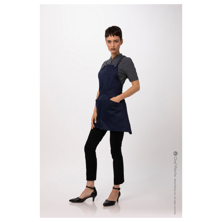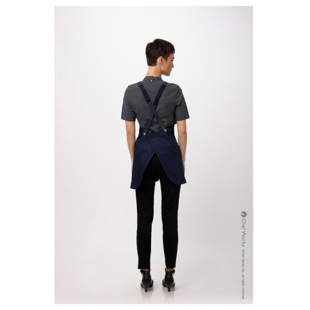 The Chef Works ABN01W-DNA-0 Largo Petite Bib Apron provides a blend of style and functionality, tailored specifically for culinary professionals. With dimensions of 25 inches in length and 38 inches in width, this apron is designed to fit petite sizes comfortably. A standout feature is the adjustable and removable neck straps, though these are sold separately, allowing for personalized comfort and versatility. The apron includes a concealed pen pocket on the chest, hip pockets with a pencil divide, and a back pocket, catering to the organizational needs of chefs and catering staff. Additional utility is offered by a D-ring and a belt loop for ties, making it ideal for various kitchen tasks. The curved hem with a front slit enhances mobility, crucial in fast-paced culinary environments. Constructed from a durable 65/35 polyester and cotton blend, this apron is both robust and easy to maintain. Its dark navy color exudes a professional appearance, suitable for both front and back-of-house roles in the food service industry. This apron is perfect for professional chefs, restaurant staff, and home cooks who prioritize both practicality and style in their work attire.