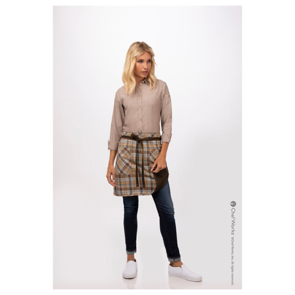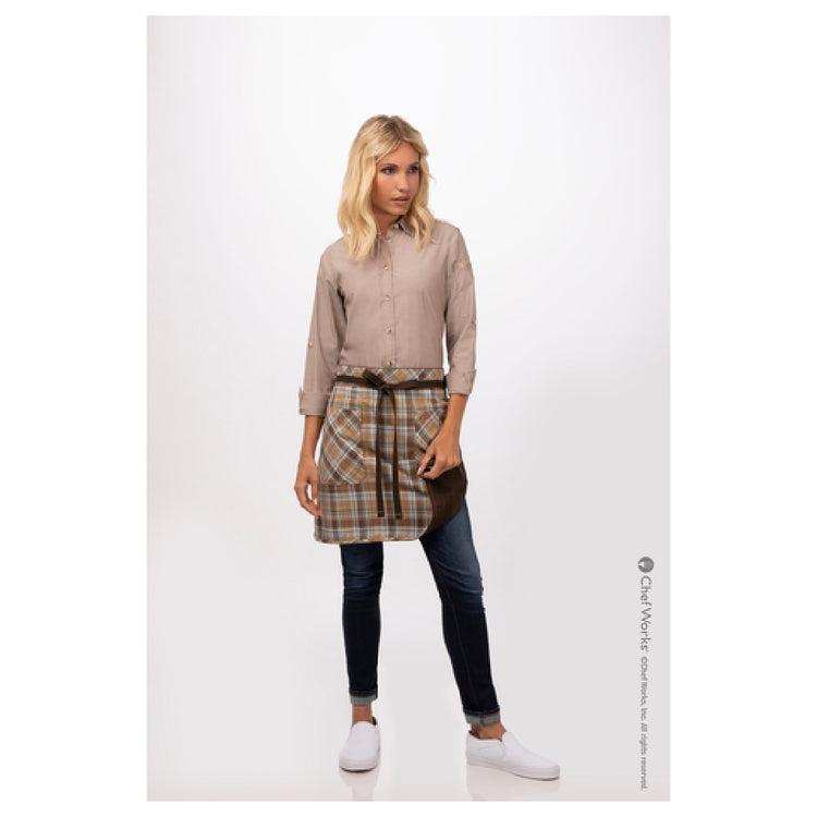 The Chef Works AHR01-BRO-0 Olympia Half Bistro Apron is a meticulously designed piece of kitchen apparel, measuring 19"L x 31-1/2"W, suitable for various culinary environments. This apron features strategically placed hip pockets on both the front and inside, offering convenient storage solutions for chefs and food service professionals. Designed for durability and comfort, it includes extra-long ties to ensure a secure fit for individuals of different sizes. Reinforced stress points and double needle stitching enhance the apron’s longevity, making it a practical choice for high-intensity kitchen settings. Made from 100% cotton, this half bistro apron combines comfort with resilience. Its reversible plaid design in a sophisticated brown color adds a touch of style, making it versatile for both back-of-house and front-of-house operations. The Chef Works Olympia Half Bistro Apron is an excellent choice for professional chefs, waitstaff, and anyone in the food service industry seeking a reliable, durable, and stylish apron solution. Its thoughtful design caters to the demands of dynamic kitchen environments, while its aesthetic appeal ensures it complements various uniform styles.