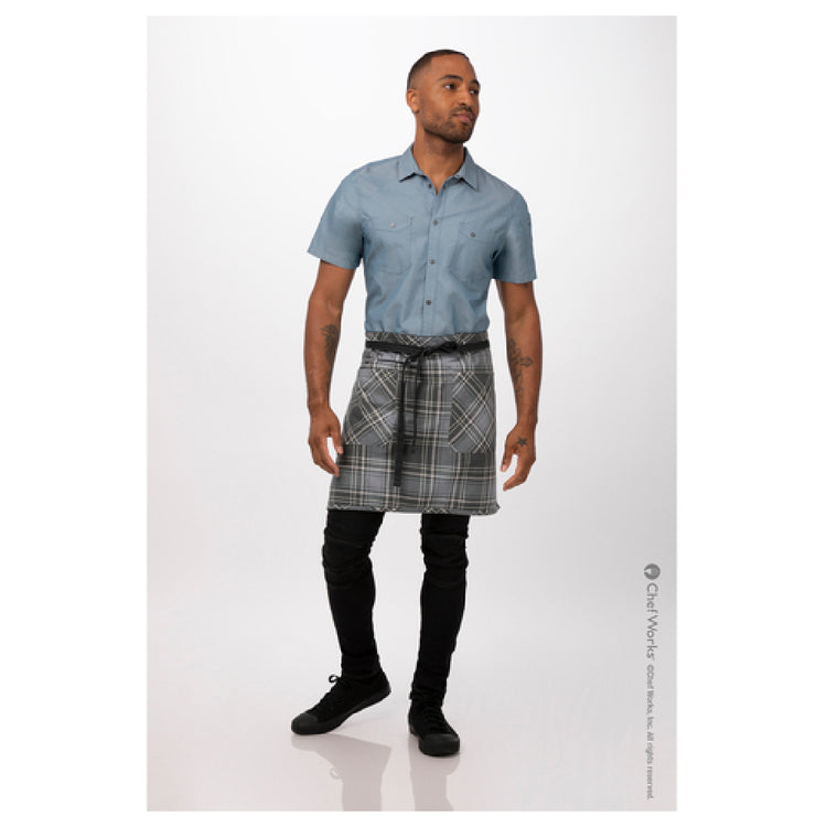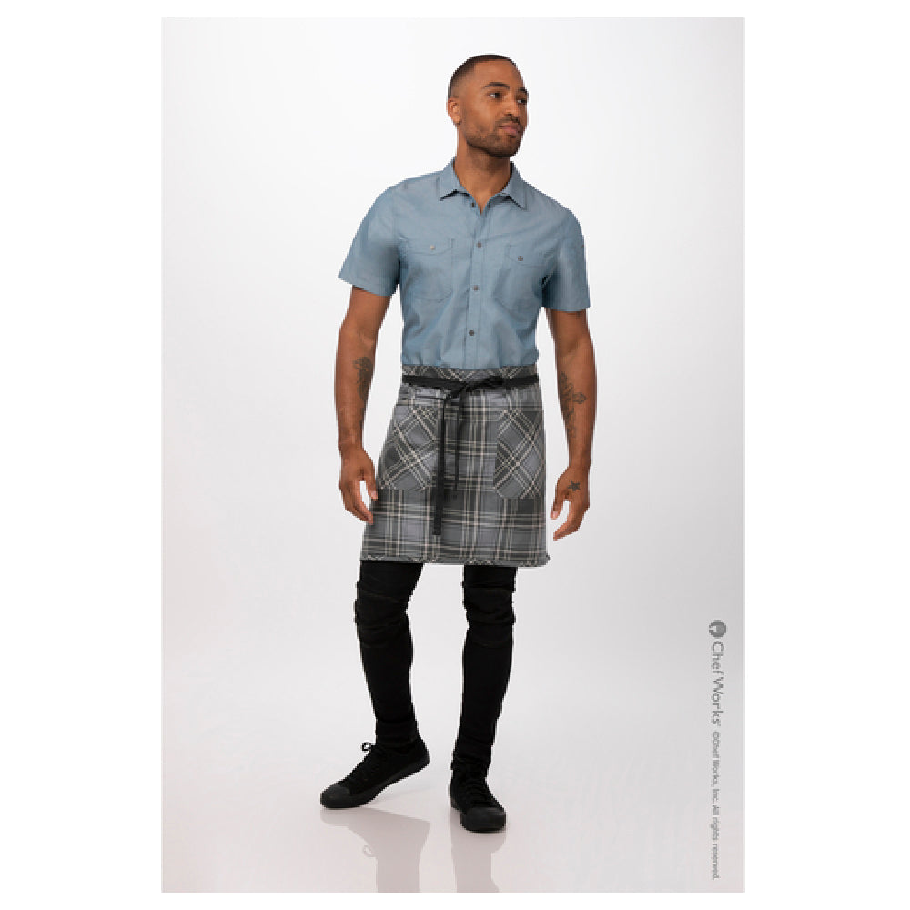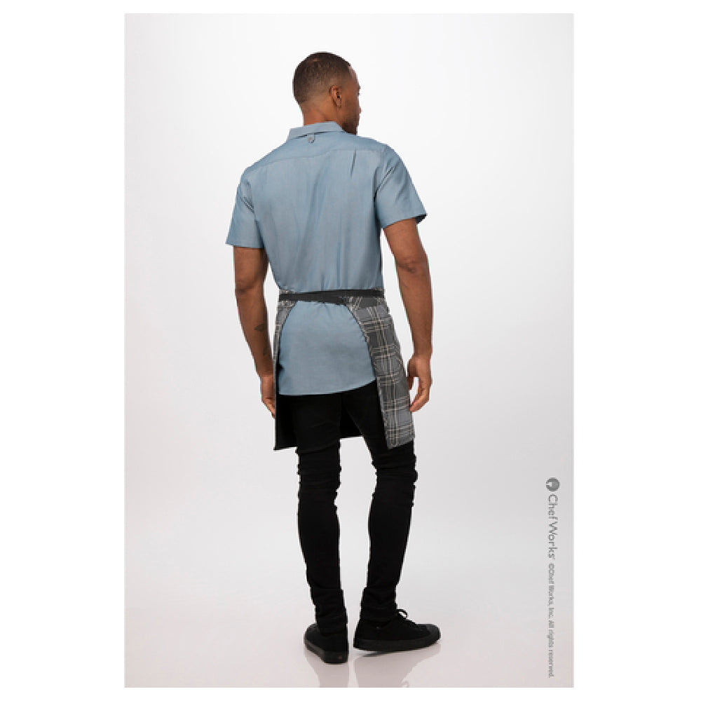 The Chef Works AHR01-GRY-0 Olympia Bib Apron is a meticulously designed accessory tailored for culinary professionals seeking both functionality and style. Measuring 32 inches in length and 36-1/2 inches in width, this apron provides ample coverage and protection. A key feature is its adjustable and removable neck strap, equipped with snaps, allowing for a customizable fit that enhances comfort during long shifts. The apron is crafted from 100% cotton, ensuring breathability and durability, while its reversible plaid design in gray adds a touch of elegance to any kitchen ensemble. Functionality is further enhanced by hip pockets located on both the front and inside, offering convenient storage for essential tools and personal items. Reinforced stress points and double needle stitching contribute to its robust construction, making it a reliable choice for demanding kitchen environments. Catering to a diverse market, from high-paced restaurant kitchens to casual home cooking, the Chef Works Olympia Bib Apron stands out as a versatile and essential addition to any culinary wardrobe, combining practicality with a sophisticated aesthetic.