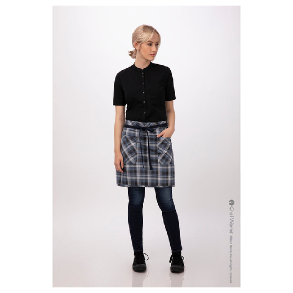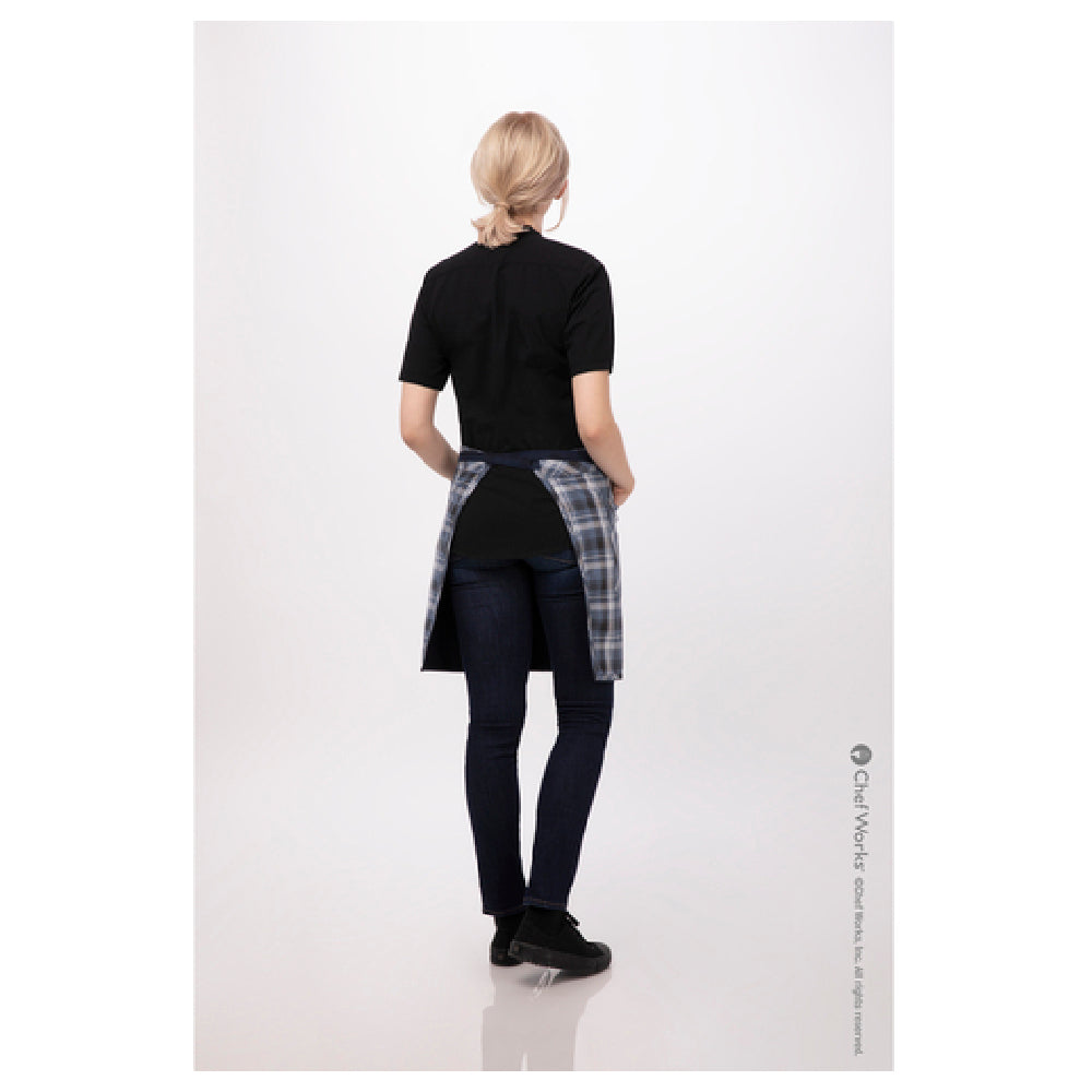 The Chef Works AHR01-NAV-0 Olympia Bib Apron is a versatile and practical garment designed for culinary professionals. Measuring 32 inches in length and 36-1/2 inches in width, this apron is crafted to provide ample coverage for chefs and cooks. It features an adjustable and removable neck strap with snaps, offering customizable comfort and convenience during extended periods of wear. The apron includes hip pockets on both the front and inside, allowing chefs to keep essential tools and items within easy reach. Reinforced stress points and double needle stitching enhance the durability of this apron, ensuring it withstands the demands of a busy kitchen environment. Made from 100% cotton, the apron combines comfort with resilience, while the reversible plaid design in navy adds a touch of style to any professional kitchen setting. This apron is ideal for different market segments within the food service industry, catering to chefs who value both functionality and aesthetics in their work attire. The thoughtful design and high-quality construction make the Chef Works AHR01-NAV-0 Olympia Bib Apron an essential piece for culinary professionals seeking both practicality and durability in their kitchen apparel.