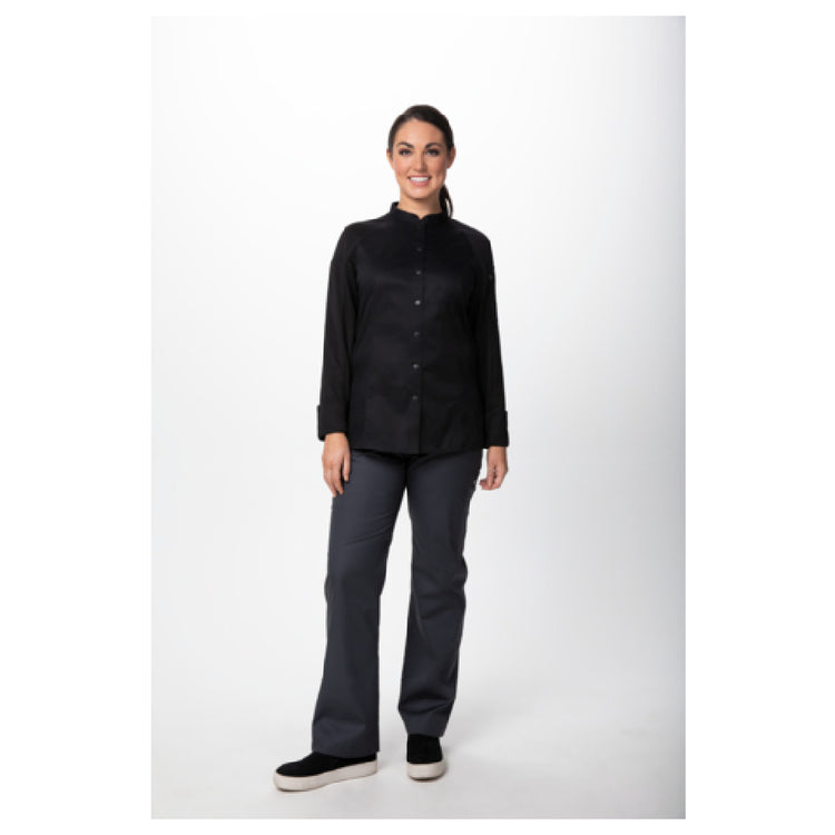 Chef Works CBS01W-BLK-M Women's Tulum Chef Coat Raglan Long Sleeve Snap Front Closure