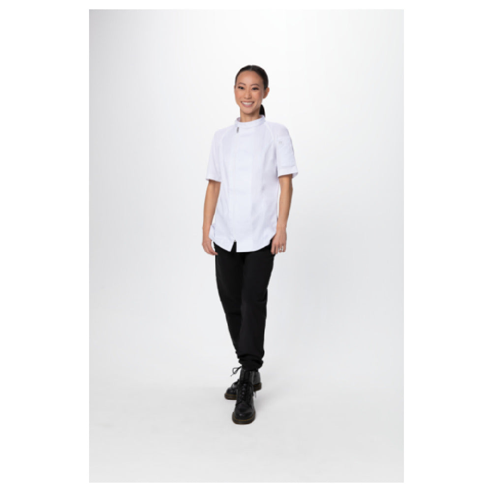 Chef Works CBZ03W-WHT-L Women's Varkala Chef Coat Raglan Short Sleeve Off-set Zip Front With Snap Collar