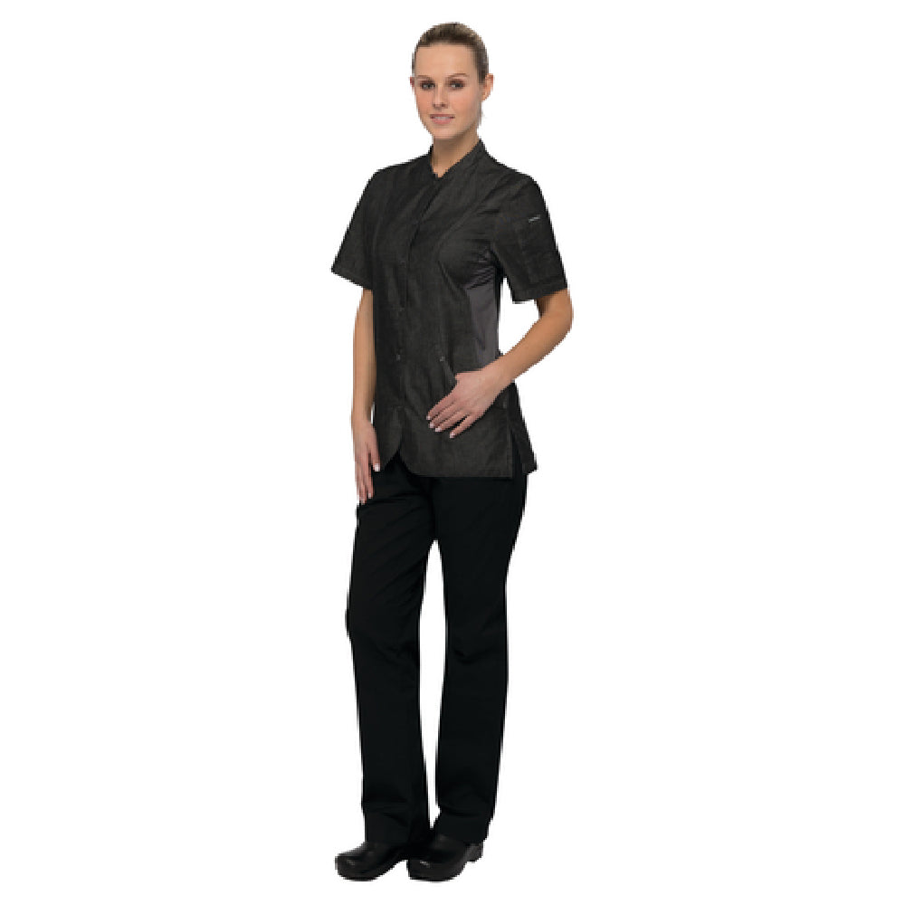 The Chef Works CES05W-BLK-2XL Women's Chelsea Chef Coat is designed for both style and functionality, making it a sought-after garment in professional kitchens. This chef coat is single-breasted with short sleeves, providing a modern aesthetic while ensuring comfort in hot kitchen environments. Featuring a snap closure system, it is easy to fasten and unfasten, which is essential for busy chefs. The coat is equipped with stretch panels on the back and sides, allowing for enhanced mobility and a tailored fit. The seam slits add a touch of elegance while contributing to the coat's flexibility. A back collar apron holder with an engraved snap provides practicality, keeping aprons neatly in place. For added convenience, it includes a left sleeve thermometer pocket and a right sleeve pocket, catering to chefs who need quick access to essential tools. The curved front hip pockets are both stylish and functional, adding to its practical design. Made from 100% cotton denim, this coat is both durable and breathable, ensuring comfort throughout long shifts. The sleek black color and slim fit design in 2XL size make this chef coat an excellent choice for culinary professionals who value both appearance and performance in their work attire.