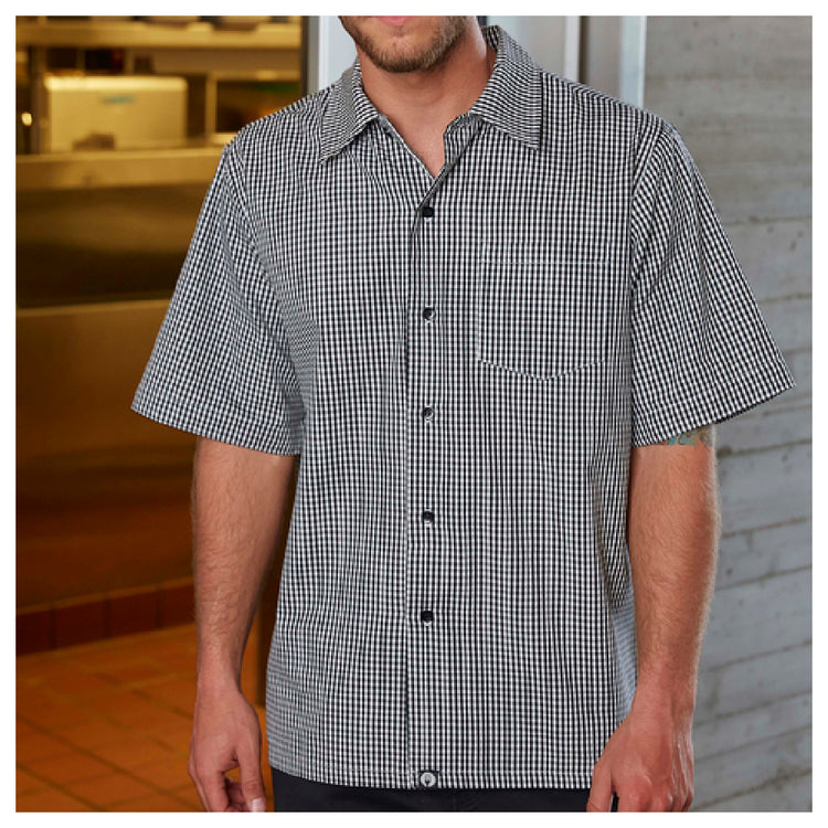The Chef Works CSCKBWC2XL Cook Shirt Short Sleeves Black Buttons is a versatile garment designed for culinary professionals seeking both style and functionality. This cook shirt features a classic fit that accommodates various body types, ensuring comfort during long hours in the kitchen. The construction consists of a durable blend of 65% polyester and 35% cotton, providing a balance of breathability and resilience. The shirt showcases a sophisticated black and white check pattern, complemented by black buttons, adding a touch of elegance to its practical design. A left chest patch pocket offers convenient storage for small tools or notepads, enhancing its utility. Available in size 2XL, this cook shirt caters to a wide range of chefs, from bustling restaurant kitchens to serene catering environments. Its short sleeves are ideal for maintaining mobility and comfort in high-temperature settings, making it a reliable choice for various culinary tasks. The Chef Works CSCKBWC2XL Cook Shirt is a testament to quality craftsmanship, combining essential features that meet the demands of professional chefs while maintaining an approachable and stylish appearance for diverse market segments within the food industry.