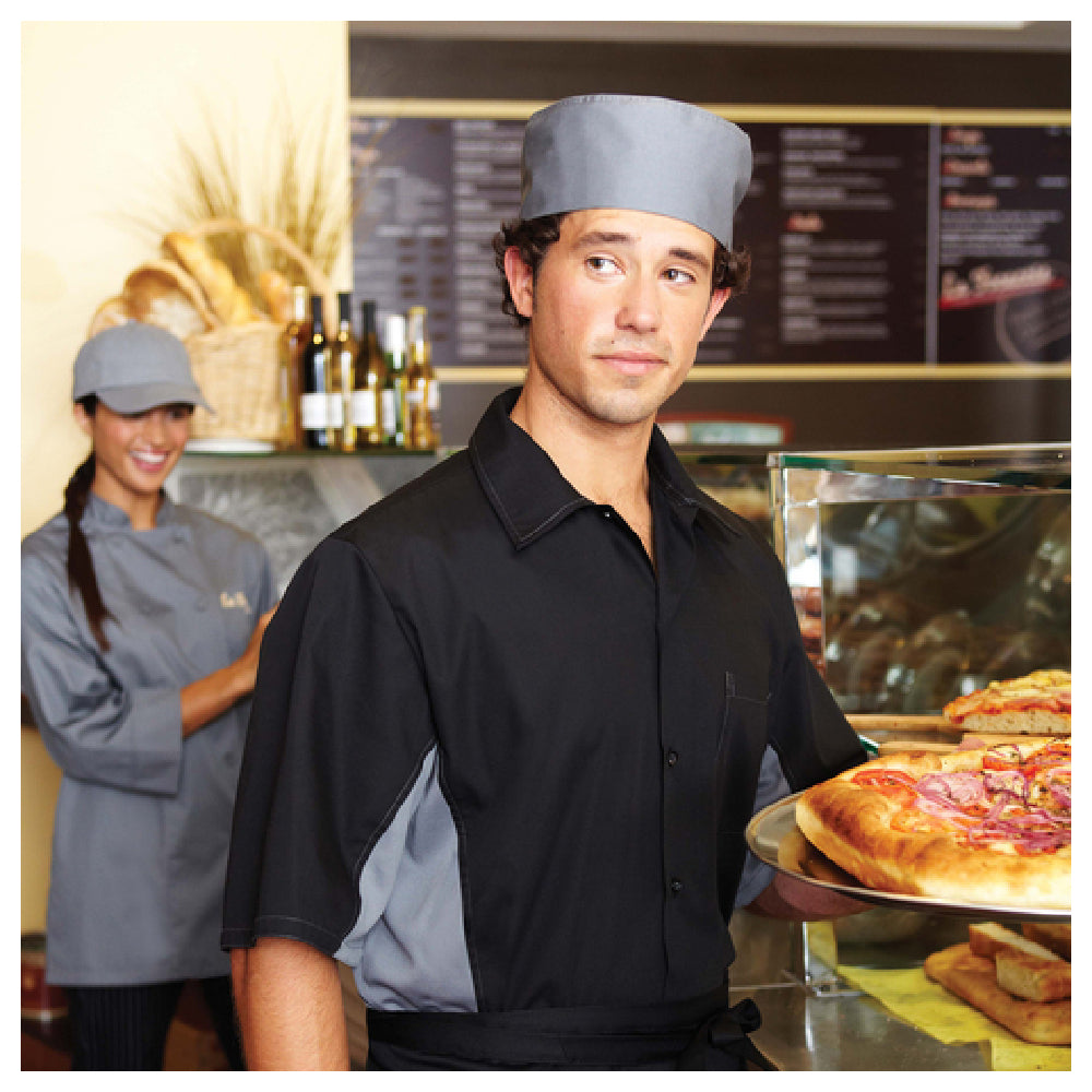 The Chef Works CSMC-BLM-2XL Men's Universal Shirt is a versatile garment tailored for culinary professionals who require comfort and functionality in the kitchen. This shirt features short sleeves and innovative Cool Vent™ panels strategically located under the arms and down the sides, enhancing airflow and breathability during long shifts. A classic fit ensures ease of movement, while contrast topstitching adds a touch of style. The shirt is equipped with matching buttons and a left chest patch pocket, offering convenience for storing small essentials. Crafted from a durable 65/35 poly-cotton blend, this shirt combines the softness of cotton with the durability of polyester, making it suitable for frequent use in demanding environments. Available in an appealing black and gray color scheme, the shirt is designed to maintain its professional appearance over time. The 2XL size accommodates a variety of body types, ensuring comfort for wearers. The Chef Works CSMC-BLM-2XL shirt is an excellent choice for chefs, line cooks, and other kitchen professionals, providing a blend of practicality, durability, and style tailored to meet the unique demands of the culinary industry.