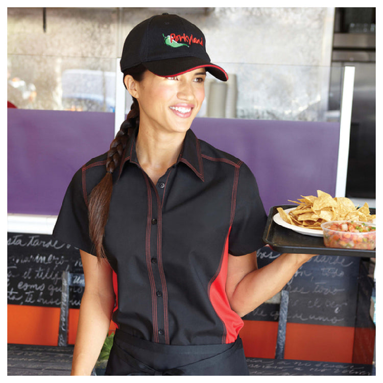 The Chef Works CSWCBRMM Women's Universal Shirt is a versatile garment designed for culinary professionals seeking a blend of style and functionality. Featuring short sleeves, the shirt is equipped with innovative Cool Vent™ panels running down both sides, ensuring optimal breathability and comfort in high-temperature kitchen environments. The triple contrast topstitching adds a touch of elegance, complementing the matching buttons that enhance its aesthetic appeal. Crafted from a durable 65/35 poly-cotton blend, this shirt balances comfort and resilience, making it suitable for the demanding conditions of the food service industry. Available in a striking black/red color combination, it offers a form-fitting design in a medium size, catering to the modern chef's need for both comfort and a professional appearance. This shirt is ideal for chefs, kitchen staff, and culinary students who require reliable and stylish workwear that supports their daily duties. Its technical features make it a standout choice for establishments that prioritize both functionality and visual appeal in their professional attire.