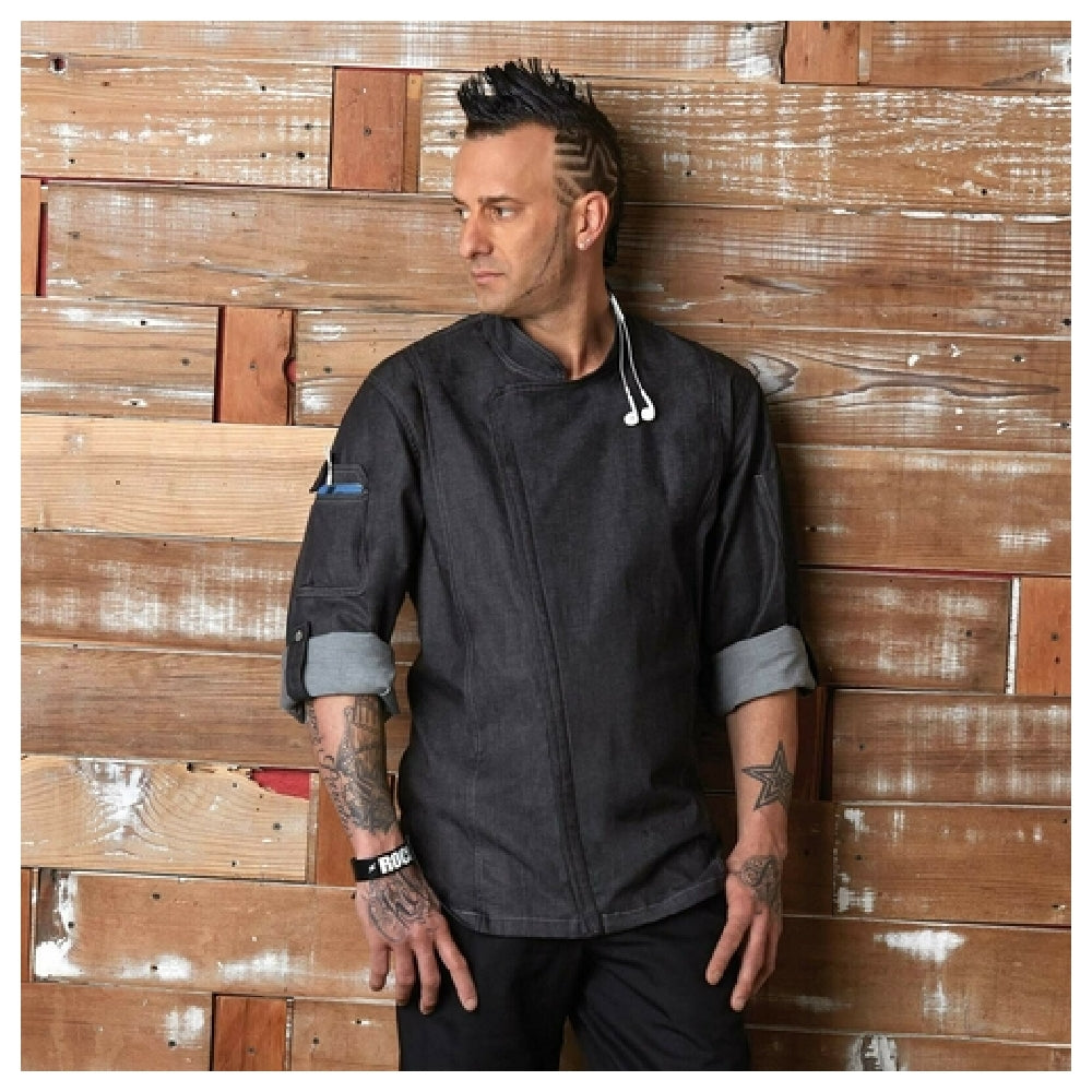 The Chef Works EXDZ001BLKXL Gramercy Chef Coat is a modern chef's essential, crafted from 100% cotton denim in a sleek black finish and available in XL. This coat is designed with a single-breasted front and a 2-way separating zipper for easy wear. Its roll-up long sleeves are equipped with tabs, allowing for adjustable comfort and adaptability in a bustling kitchen environment. The coat features contrast double-stitching throughout, enhancing both its aesthetic appeal and durability. For functionality, the left sleeve includes a rounded thermometer pocket, while the right sleeve offers a rounded cell phone or notebook pocket complete with a hidden earphone hole, catering to the tech-savvy chef. An innovative back collar apron holder with an engraved snap provides practical support, ensuring that aprons remain securely in place. The modern fit of this chef coat not only offers a contemporary look but also prioritizes comfort and mobility, making it an excellent choice for chefs in various culinary settings. The Chef Works Gramercy Chef Coat is designed to meet the diverse needs of culinary professionals, combining style, practicality, and innovation in one exceptional garment.