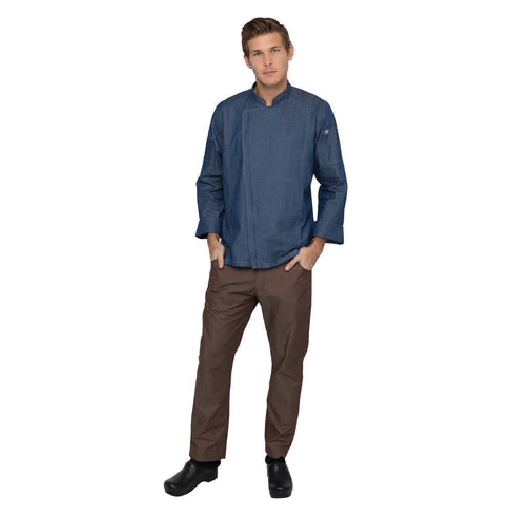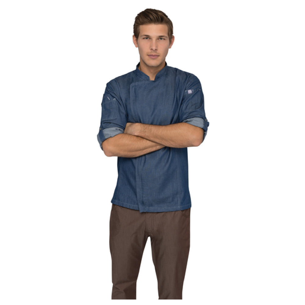 The Chef Works EXDZ001IBLL Gramercy Chef Coat is a versatile addition to any culinary professional’s wardrobe. Featuring a single-breasted design, this coat is crafted from 100% cotton denim, providing comfort and durability in a modern fit. Its indigo blue hue adds a touch of sophistication, while the contrast double-stitching throughout ensures structural integrity. The roll-up long sleeves come equipped with a tab, allowing chefs to easily adjust their sleeve length for comfort and convenience. A 2-way separating zipper enhances ease of wear, and the back collar apron holder with an engraved snap is a thoughtful detail that aids in maintaining a neat appearance. Practicality is at the forefront with its functional pocket design: a rounded thermometer pocket on the left sleeve and a rounded cell phone/notebook pocket with a hidden earphone hole on the right sleeve. This chef coat is ideal for dynamic kitchen environments, catering to the needs of culinary experts across various sectors—be it bustling restaurants, catering services, or personal chef operations. Its blend of style, functionality, and high-quality materials makes it a standout piece for professionals who prioritize both performance and presentation in their culinary attire.