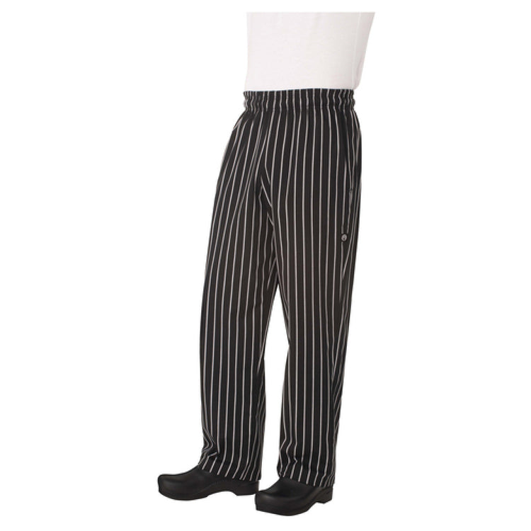 Chef Works GSBP-000-L Designer Baggy Pants are crafted for culinary professionals seeking both style and functionality in their work attire. These pants feature an elastic waistband with a drawstring, ensuring a comfortable and adjustable fit for various body types. The tapered legs provide a modern and sleek silhouette, enhancing the professional appearance. With two side seam pockets and one back pocket, these pants offer ample storage for personal items or small kitchen tools, making them practical for busy chefs and kitchen staff. They are designed with a classic fit and composed of a durable 65/35 poly/cotton blend in black with striking chalk stripes, catering to those who value both durability and elegance in their kitchen wear. The large size is specifically tailored for those requiring additional room, ensuring ease of movement throughout a demanding workday. These pants are ideal for culinary environments that demand high performance and style, including restaurants, catering services, and culinary schools, where the blend of comfort, utility, and professional aesthetics is paramount.