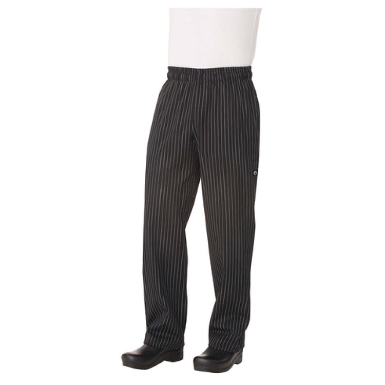 Chef Works PINB-000-L Designer Baggy Pants - Known for their exceptional comfort and classic fit, these pants feature an elastic waistband with a drawstring for customizable fit and ease of wear. Designed with a focus on functionality and style, they come with tapered legs, providing a modern silhouette suitable for dynamic kitchen environments. Constructed from a durable 65/35 yarn-dyed poly/cotton blend, these pants offer a balance of breathability and resilience, ideal for the fast-paced demands of culinary professionals. The black fabric adorned with white pinstripes adds an element of sophistication, making them a versatile choice for both formal and casual kitchen settings. Practicality is enhanced with two side seam pockets and one back pocket, allowing chefs to carry essential tools or personal items conveniently. Available in a large size, these pants are tailored to meet the varied needs of culinary experts, from bustling restaurant kitchens to culinary schools. The Chef Works PINB-000-L embodies a blend of comfort, function, and style, offering a reliable garment option that supports chefs in maintaining high performance without compromising on aesthetic appeal.