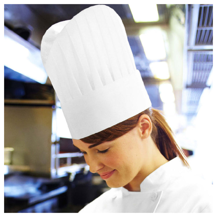 The Chef Works PLEA-WHT-12 Le Toque Chef Hat 12" H European Style is a meticulously crafted headwear piece designed to meet the demands of culinary professionals. Standing 12 inches tall, this chef hat embraces a European style that contributes to its elegant appearance. It features an oval top pleat, adding a touch of sophistication to its design. The hat is fully adjustable, ensuring a comfortable fit for a wide range of head sizes, encapsulated by its "one size fits most" specification. Constructed from lightweight poly-viscose material, the hat offers a breathable experience, essential for long hours in the kitchen. The non-woven fabric composition contributes to its durability and easy maintenance, making it a practical choice for chefs across different culinary environments. The pristine white color of the hat not only aligns with traditional culinary aesthetics but also reflects the professional standards expected in the industry. This chef hat is suitable for various segment markets within the culinary field, from bustling restaurant kitchens to gourmet catering services, offering a combination of style, functionality, and adaptability that is vital for chefs who value both form and function in their professional attire.